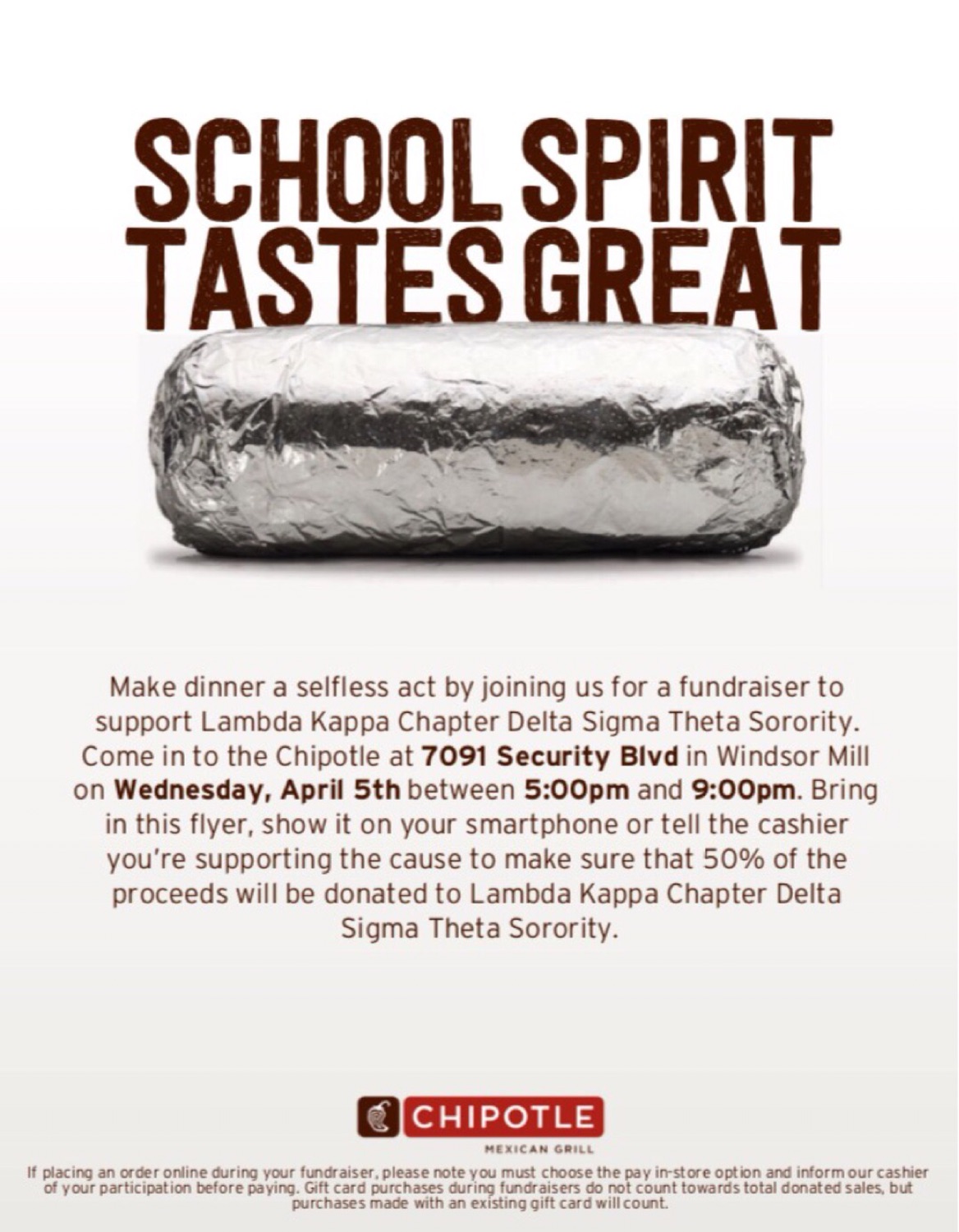 We will have our annual Chipotle fundraiser at 7091 Security Blvd in Windsor Mill this Wednesday , April 5, from 5-9pm . Please be sure to tell the cashier that you are supporting Lambda Kappa at checkout! Hope to see you all soon !