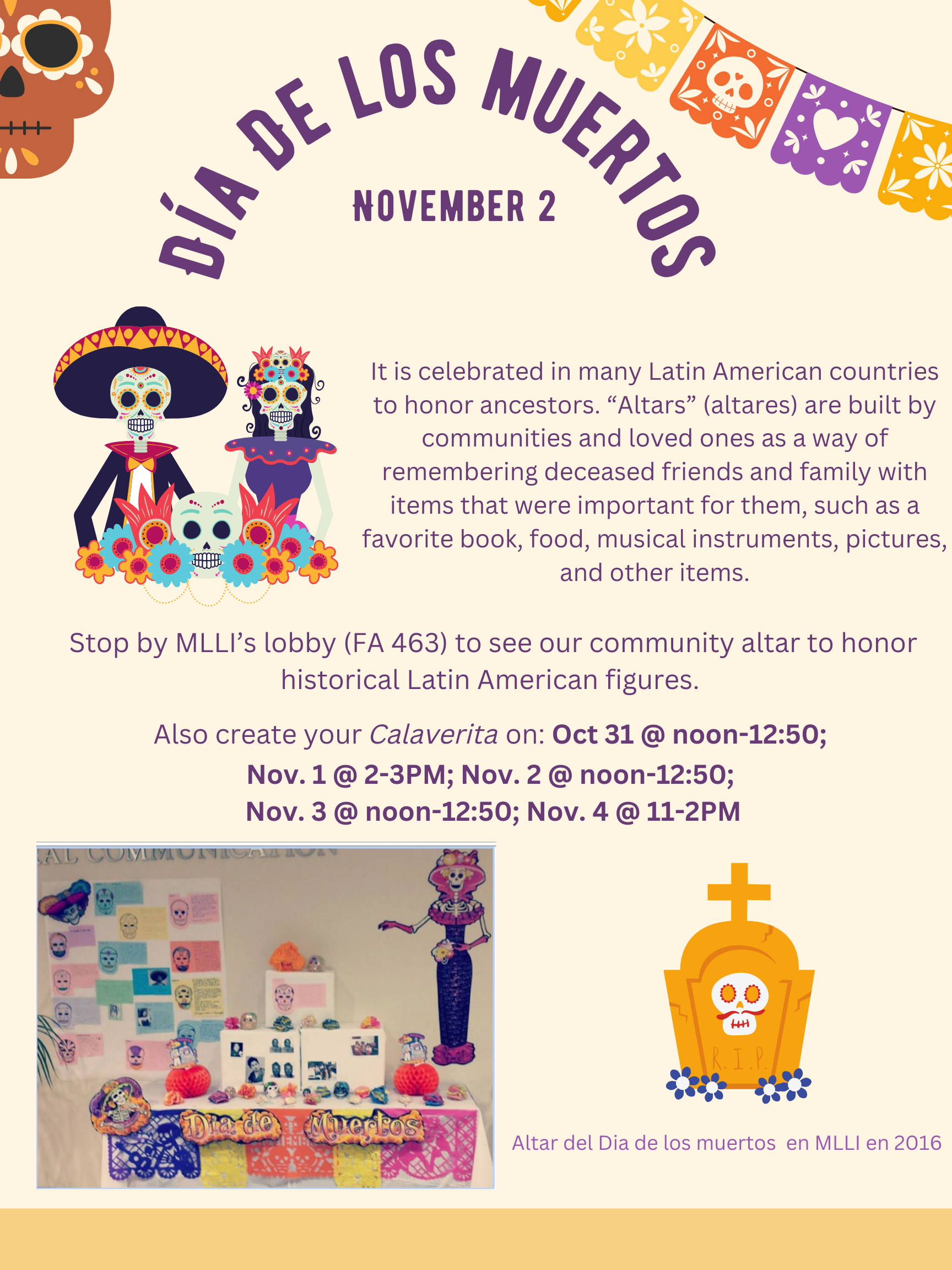 MLLI-Spanish Area highlights El Día de Los Muertos, or Day of the Dead, Oct 31-Nov 2 with an Altar to honor historical Latinx American figures. You are invited to stop by to see our community Altar and create your Calaverita. See flyer for details.