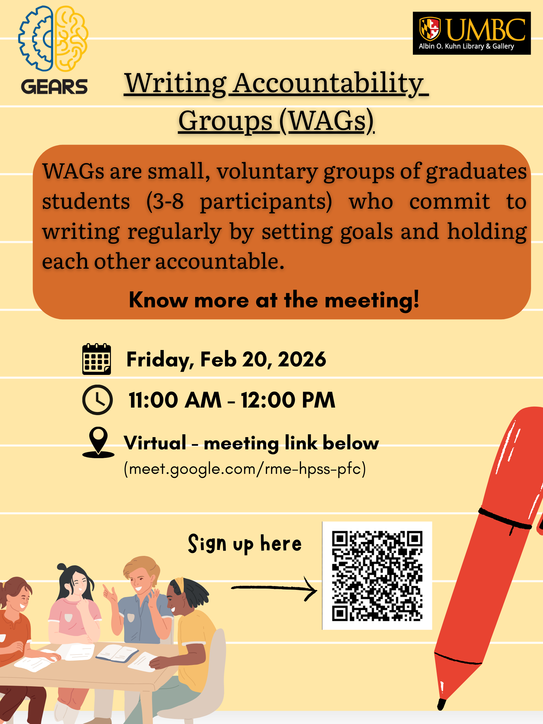 - What: Writing Accountability Groups (WAGs) are voluntary and facilitated by fellow UMBC graduate students.