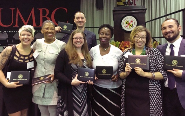 [Left to right] Jessica Floyd, Shirley Basfield Dunlap, Tymofey Wowk (in back), Kimberly Feldman, Shawntay Stocks, Erin Berry, Ibrahim Er. Not pictured (and who was unable to attend): Mary Laurents and Shani Fleming