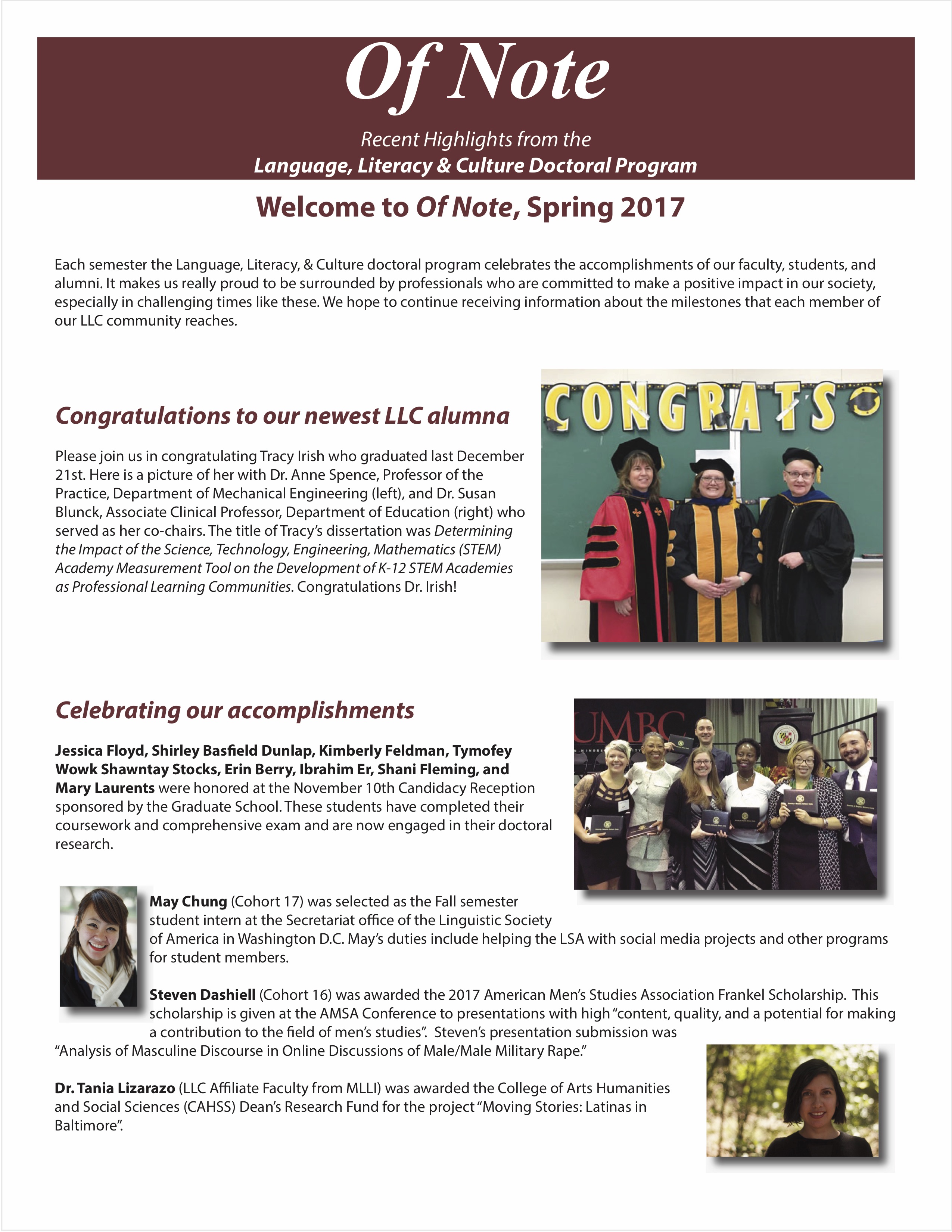 We have just released the fourth issue of our eNewsletter, Of Note. It provides an overview of the most recent, notable accomplishments and activities of the Language Literacy & Culture Doctoral Program’s faculty, staff, students, and alumni. Enjoy! You can download it here.