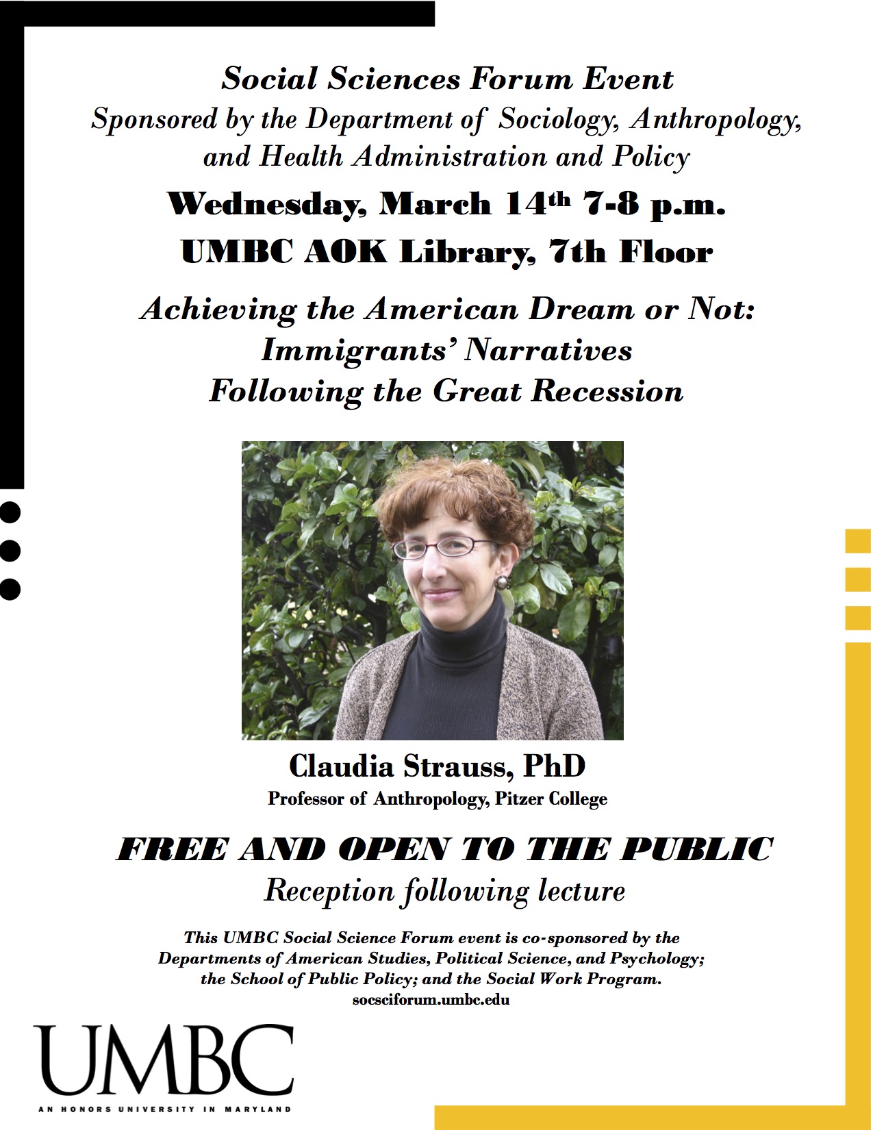 1) Social Science Forum: Wednesday, March 14, from 7-8pm on the 7th Floor of the Library. Dr. Strauss will speak about "Achieving the American Dream or Not: Immigrants’ Narratives Following the Great Recession" (See flyer attached)