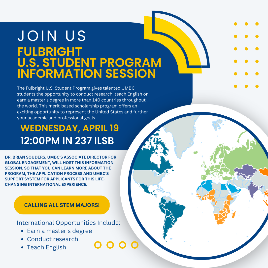 Join us on Wednesday, April 23rd in ILSB 237 for a Study Abroad and Fulbright U.S. Student Program Information Session. LSAMP Research Fellow and U-RISE Scholar and Gilman Scholarship recipient, Aye Tuedon and Dr. Brian Souders, UMBC's Associate Director for Global Engagement, will host this information session, so that you can learn more about different international opportunities, the application processes and UMBC's support system for applicants for this life-changing international experiences.
