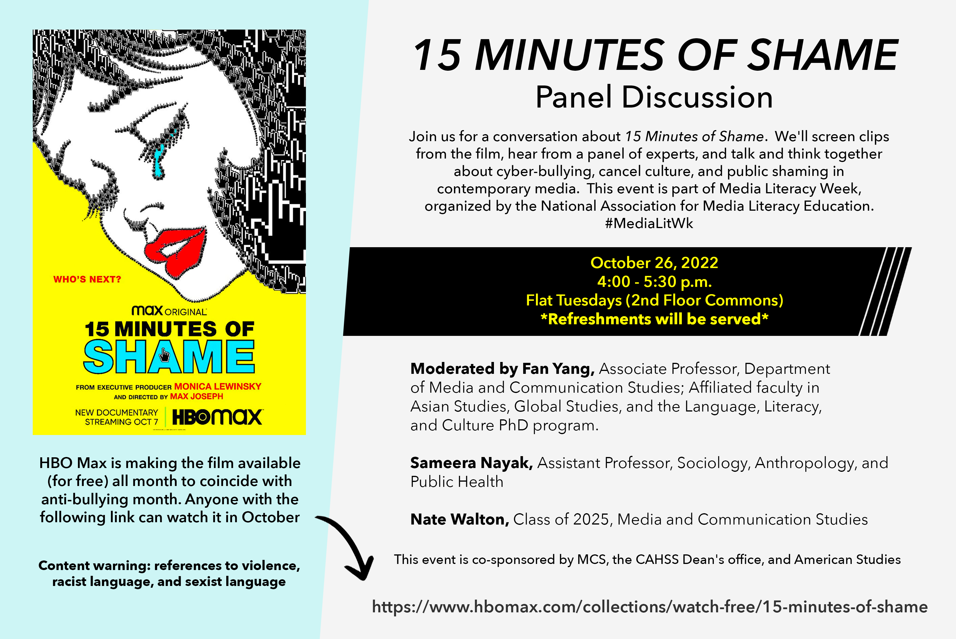 Please consider joining us for a panel discussion on the documentary 15 Minutes of Shame, which focuses on public shaming, cyber-bullying, and cancel culture. The event is Wednesday, 10/26, 4:00-5:30 at Flat Tuesdays. There will be snacks! We'll be screening some clips from the documentary, but you can also watch it for free before that ... link on the attached flyer. Hope to see you there!