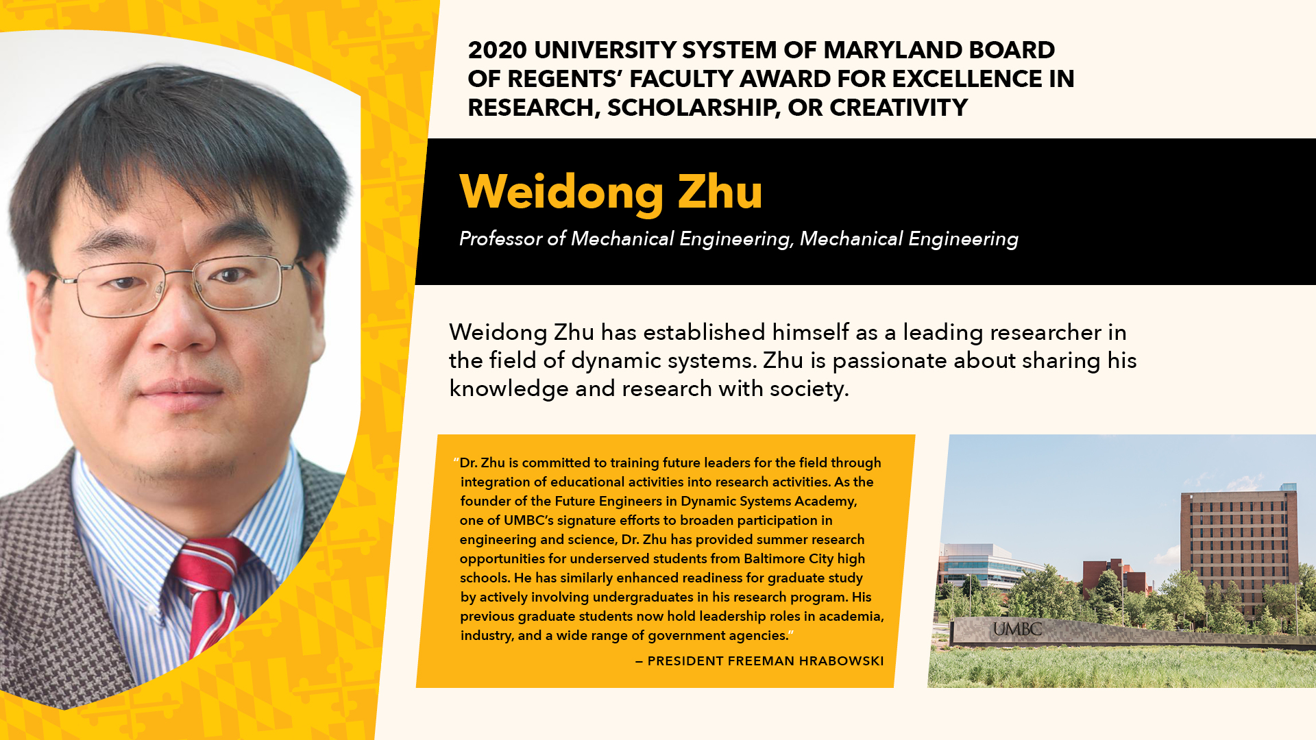 His research has significantly impacted the quality of everyday life for many people, including by producing safe and efficient structures such as elevators, wind turbines, and automotive transmissions. Zhu is passionate about sharing his knowledge and research with society. He has given more than 180 presentations at major international conferences, delivered nearly 25 keynote addresses, and given 145 seminars at companies and institutions around the world. His productivity as a researcher at UMBC is recognized as one of the strongest at the institution. His contributions have been innovative and highly impactful. As a result of his expertise, numerous large companies have called on Zhu to address large challenges they face.