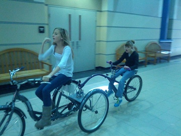 In response to a request from V-LINC (www.v-linc.org), an organization that provides technology solutions to people with disabilities, two teams of students in the ENME444 capstone course designed and built bicycles to enable the teenagers to enjoying riding bikes in their neighborhood and with their families. Riding on a bicycle and the act of pedaling has been shown to provide a positive therapeutic benefit. By making adaptations to allow parents to push their child on a bike (for Bria, below bottom) or creating a tandem arrangement to ride with her Mom (for Katy, below top), these two girls will now be able to enjoy bicycling with their families.