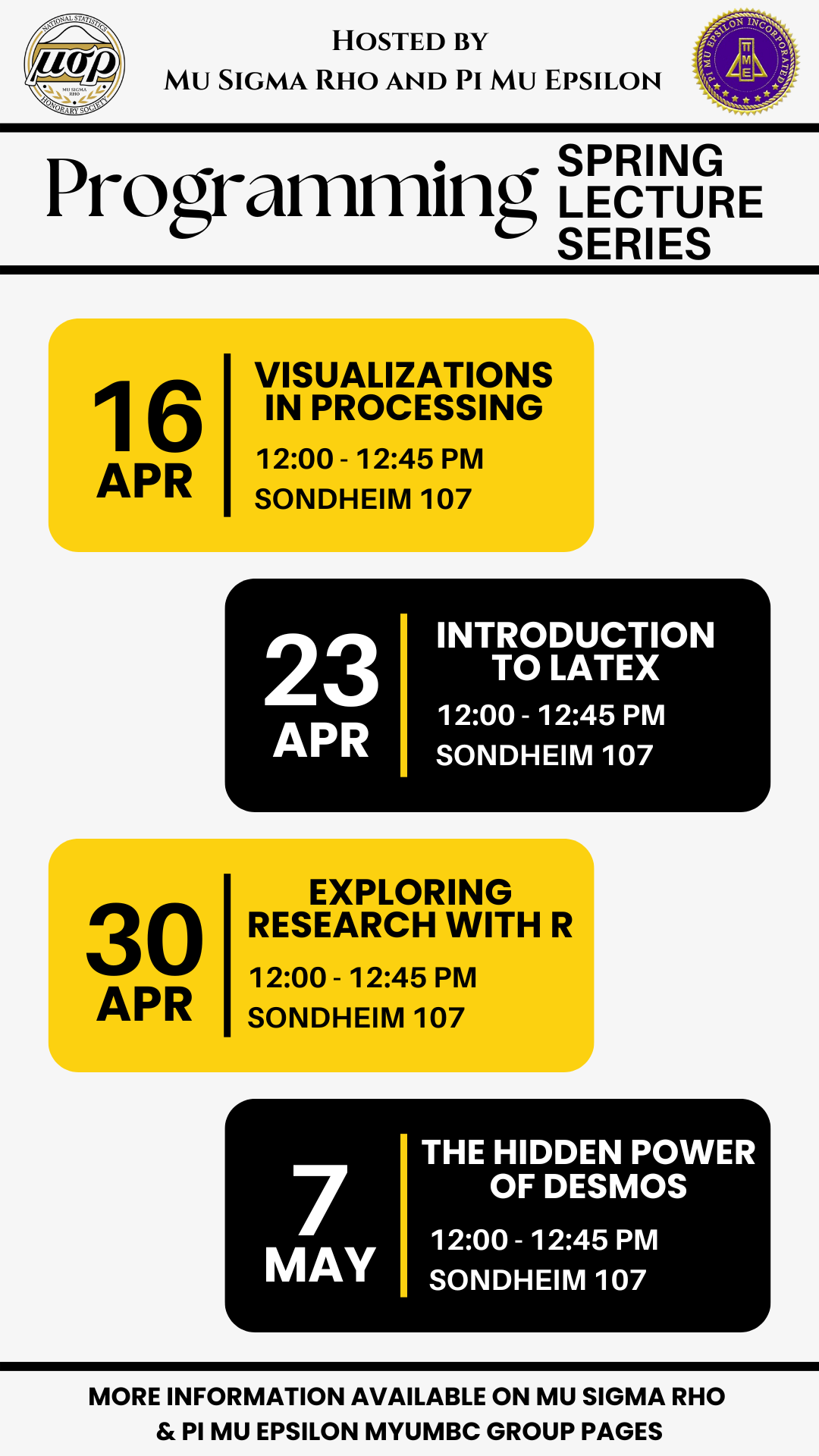 Mu Sigma Rho and Pi Mu Epsilon are delighted to announce a four-part lecture series focused on programming! This series features engaging talks from Undergraduate students majoring in Mathematics or Statistics.