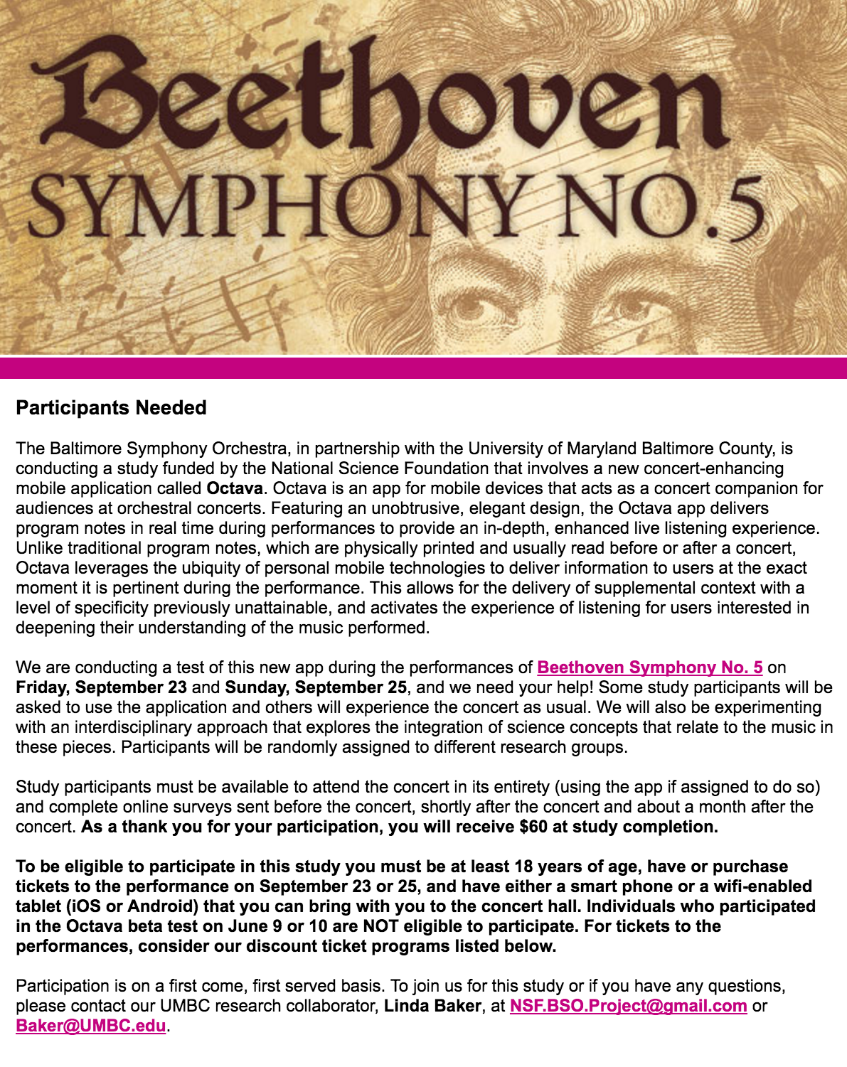 Octava, a program notes app developed by our own Dr. Linda Dusman, is testing their new app during the Baltimore Symphony Orchestra's performances of the Beethoven Symphony No. 5 on Friday, September 23 and Sunday, September 25, and they need your help! Some study participants will be asked to use the application and others will experience the concert as usual. They will also be experimenting with an interdisciplinary approach that explores the integration of science concepts that relate to the music in these pieces. Participants will be randomly assigned to different research groups.