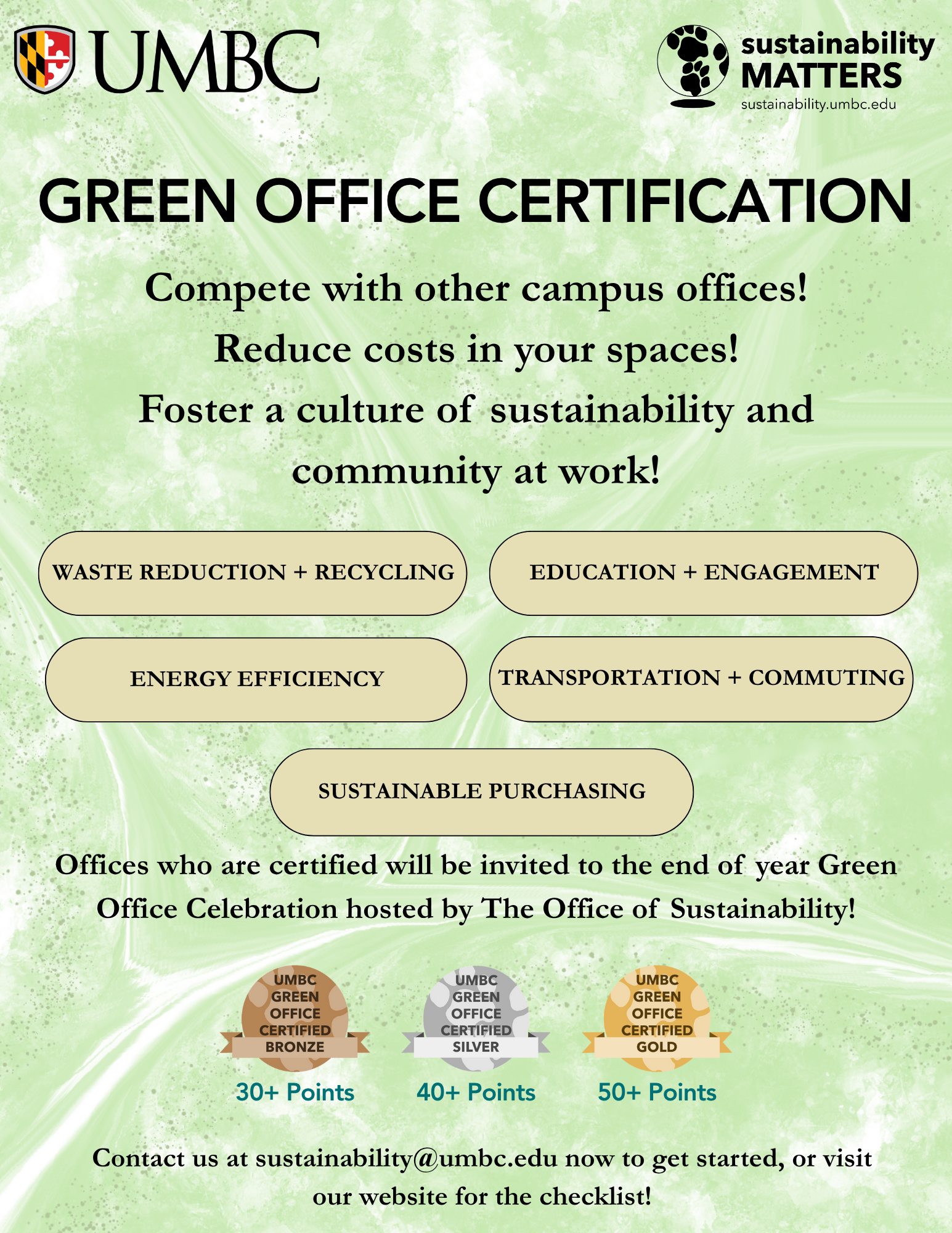 This summer, the Office of Sustainability has revamped and relaunched the Green Office Certification program, encouraging campus faculty and staff to showcase UMBC's leadership in sustainability while reducing costs in office spaces, and participating in friendly competition!