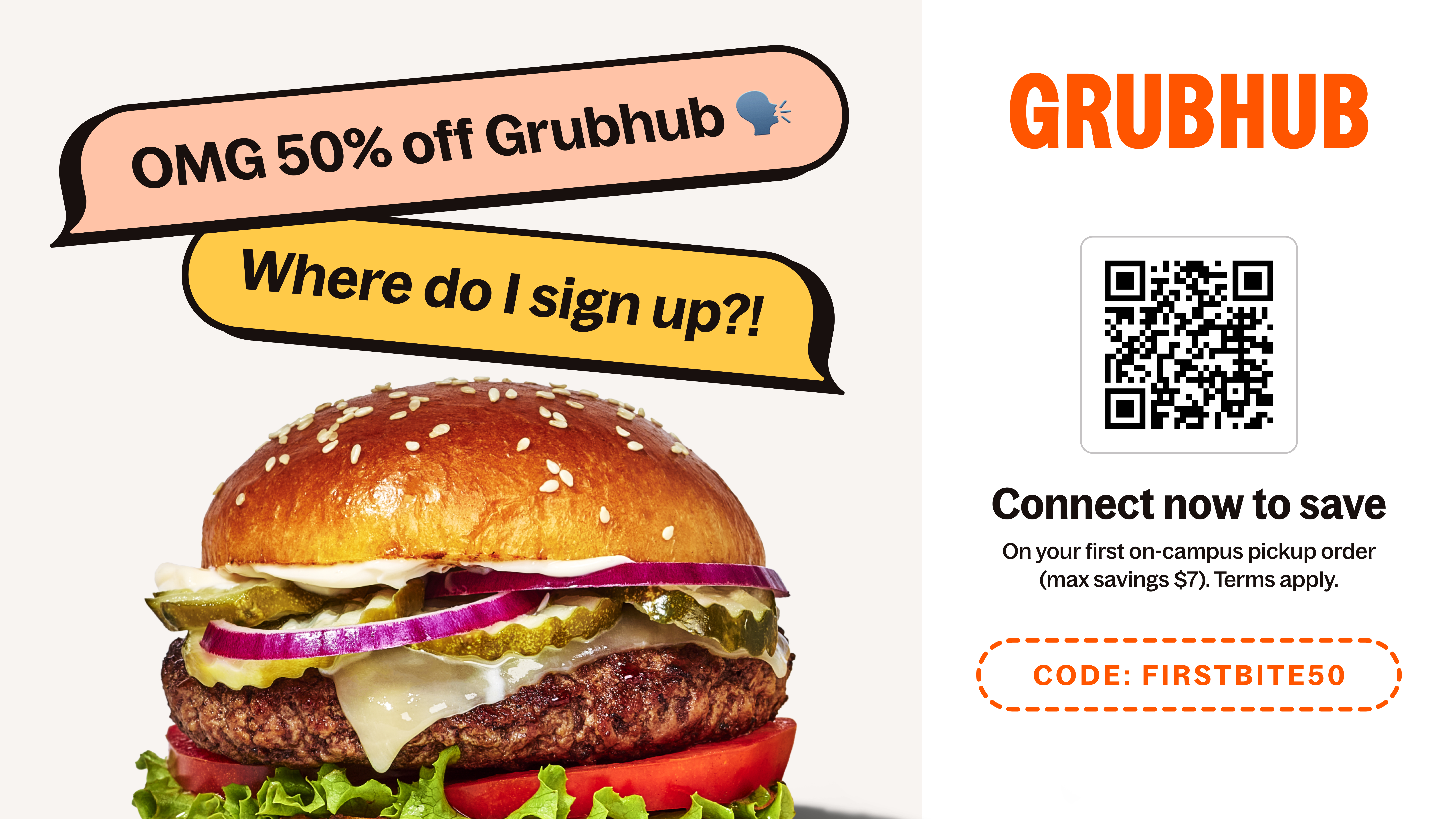 Grubhub is now on campus! Scan the attached QR code for 50% off your first order.