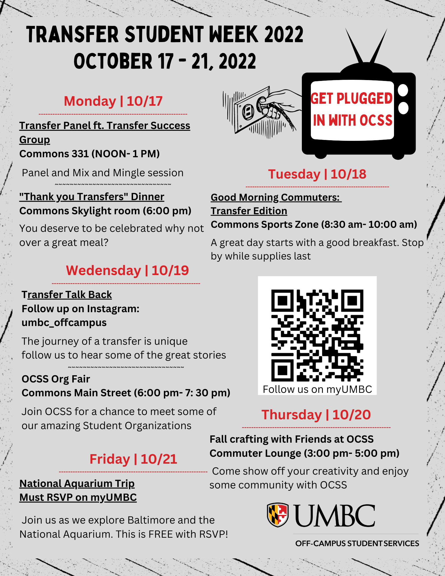 Join Off-Campus Student Services as we end our Transfer Student Week with a trip to the National Aquarium. We will be Leaving from UMBC at promptly 9:15 am and returning back to campus from the Aquarium at 3:30 pm.