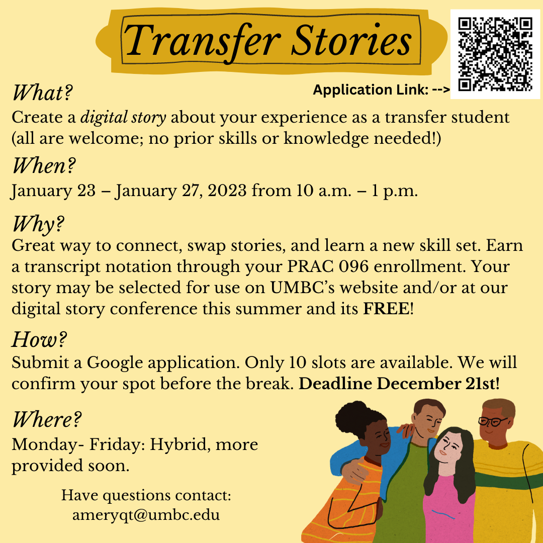 Create your own digital story about your transfer experience! This week-long workshop (Jan 23-27, 2022) will teach you the narrative and technical skills needed to create a 2-3 minute digital story about YOU! No prior knowledge needed. This is a great opportunity to build community, swap stories, and learn new skills!
