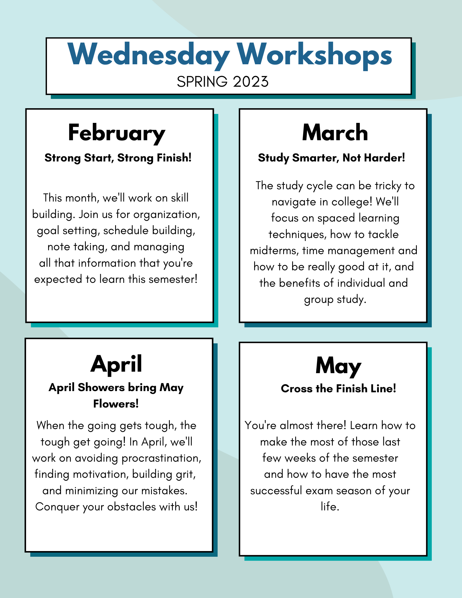 All workshops are on Wednesday starting today Feb. 1st, 2023 from 12-1 pm in UC115.