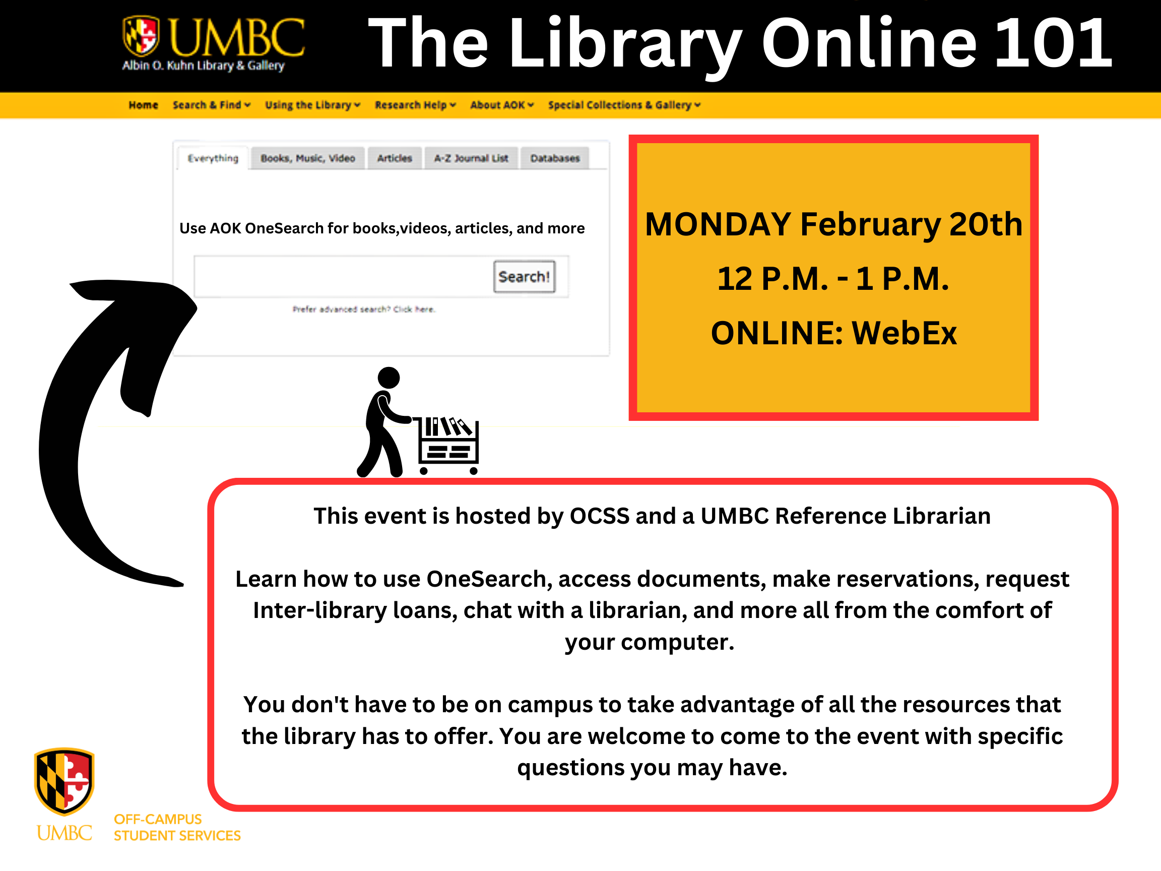 The Library Online 101 - Learn how to use one search, access documents, make reservations, request Inter-library loans, chat with a librarian, and more all from the comfort of your computer.