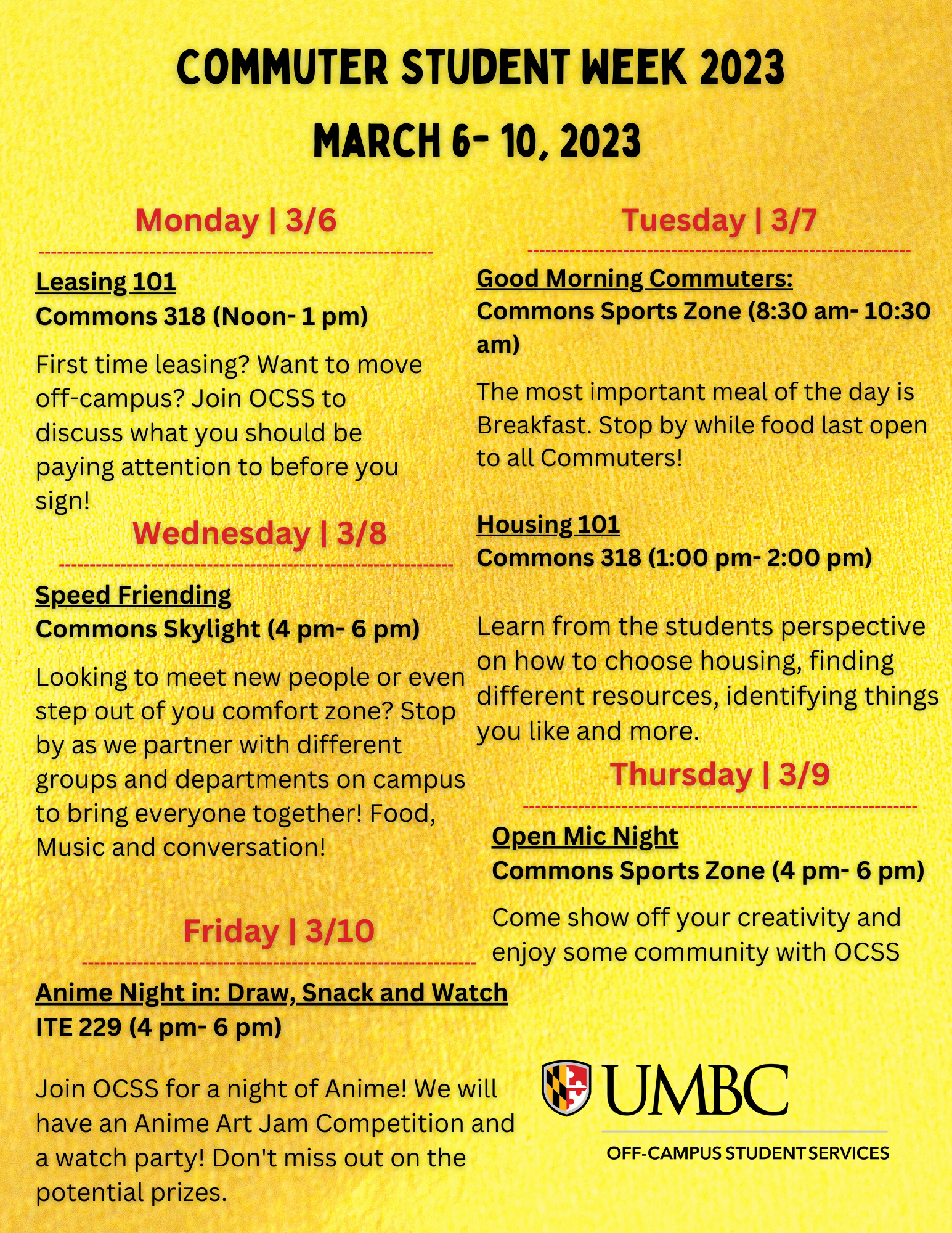 Mark your calendars! Off-Campus Student Services (OCSS) will be hosting Commuter Student Week from March 6 –10. Please join OCSS as we host events every day of next weekdedicated to empowering, educating, and most importantly connecting commuter students to all the great resources offered here at UMBC.