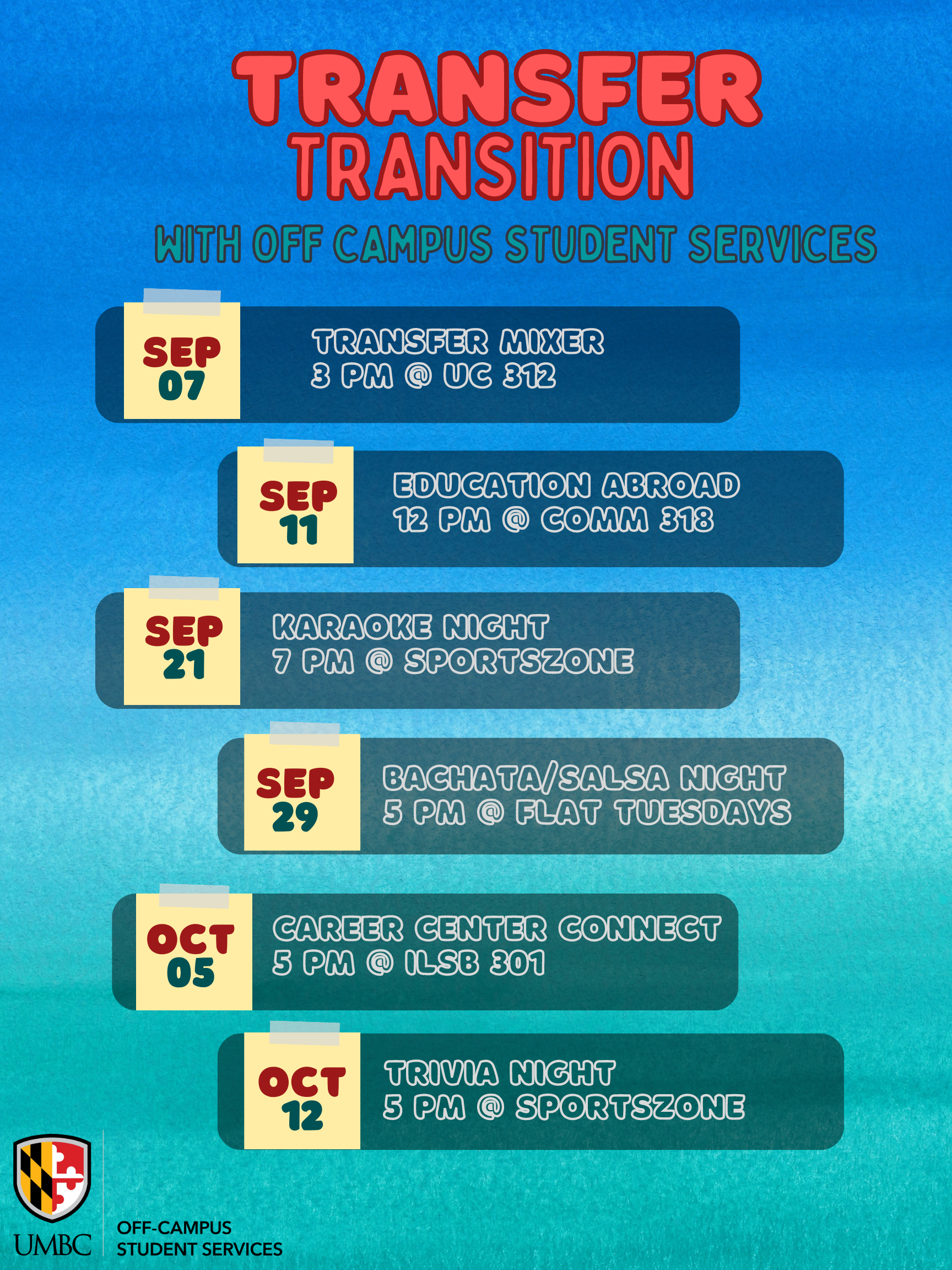 Join OCSS for 6 weeks of workshops and events leading up to Transfer Student Week October 16th- October 20th! Events Ranging for Education Abroad workshops to Trivia Night! WE have your covered! Transitioning to a new place can come with challenges let OCSS help support the journey!
