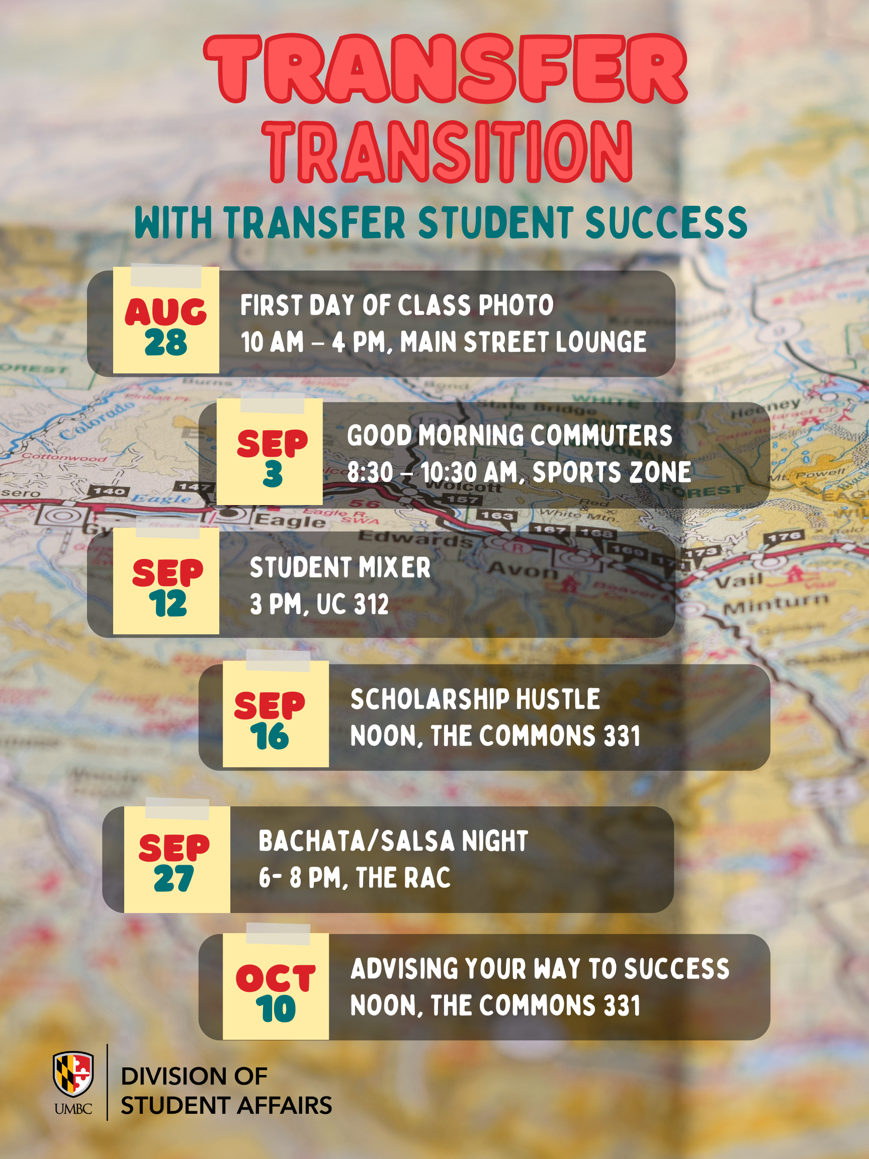 Join Transfer Student Success for 6 weeks of workshops and events leading up to Transfer Student Week October 21! Events Ranging for First Day of Class Photos to Scholarship! We have your covered! Transitioning to a new place can come with challenges let us help support the journey!