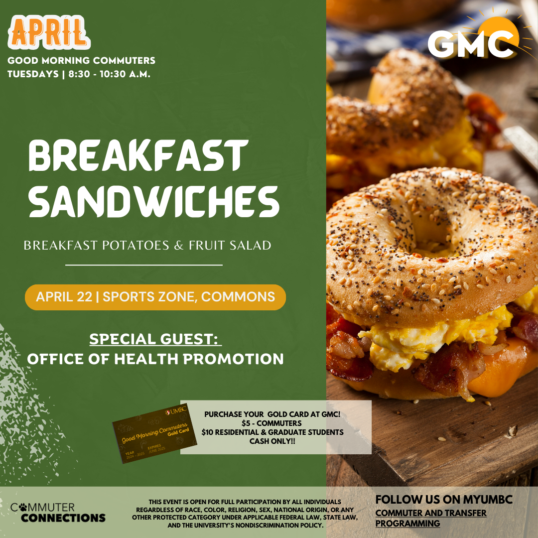 Enjoy breakfast with other UMBC commuters and get connected with on-campus resources! There isn't a better way to start your day!