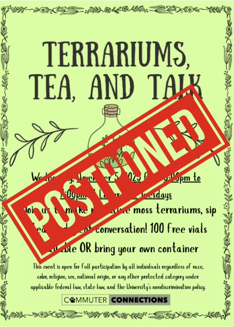 Terrariums, Tea, and Talk is currently postponed until future notice! Further updates will be posted on instagram and MyUMBC when we are able to reschedule, and we will hopefully be hosting this event soon!!