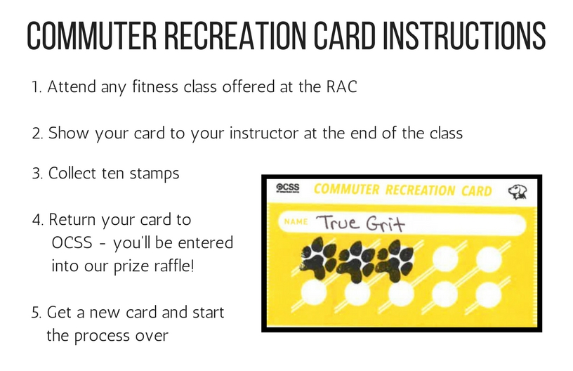 Any commuter can participate in this program! Simply show your card at the end of every fitness class that you attend in the RAC and your instructor will stamp your card. After you collect ten stamps, drop your card off at OCSS and you will be entered into a raffle to win cool prizes! Start a second card to have even more chances to win!