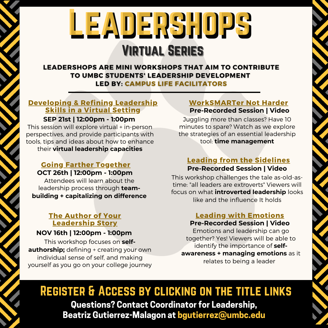The Leadershops series consists of workshops that focus on various student centered leadership-related topics facilitated by Campus Life staff and student leaders. This program aims to contribute to the leadership development and ongoing learning of UMBC undergraduate students.