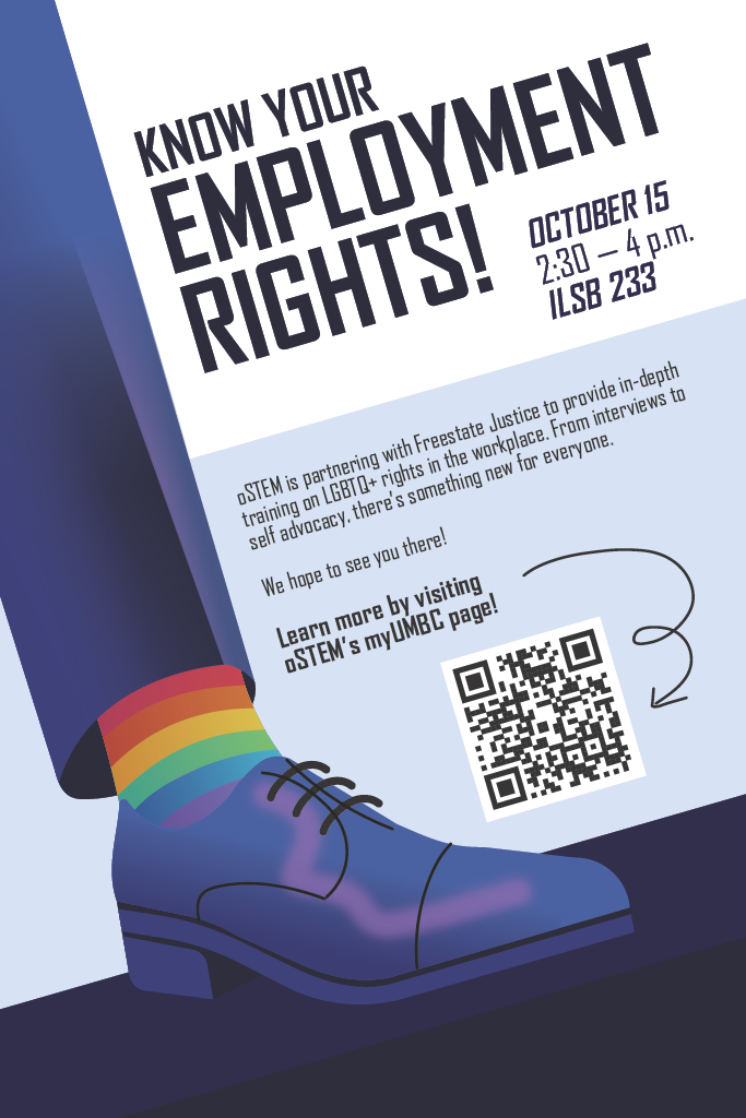 oSTEM, in collaboration with FreeState Justice, presents Know Your Employment Rights! This is a training that encompasses what you may encounter in the workplace as a queer person and protections-- advice on identifying yourself as LGBTQ+ at work, legal and preferred names usage, rights in the workplace, etc. This is open to all students and staff, and we encourage your non-STEM friends to attend!