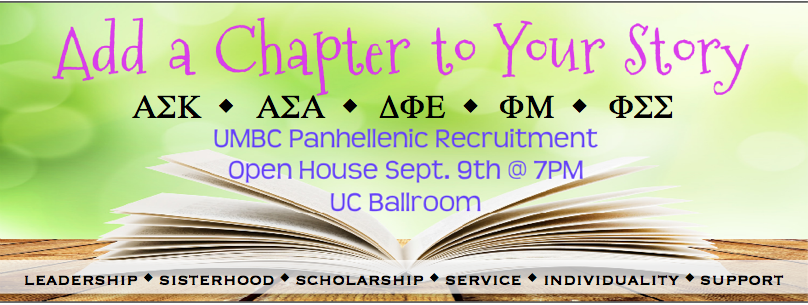 Come out and meet the lovely ladies of PHA at our Open House on September 9th at 7:00 PM in the UC Ballroom to kick off Fall Recruitment 2013! Learn what UMBC Greek life is all about and get to know our five amazing PHA sororities. We are so excited to meet you and hope you add a chapter to your story!
