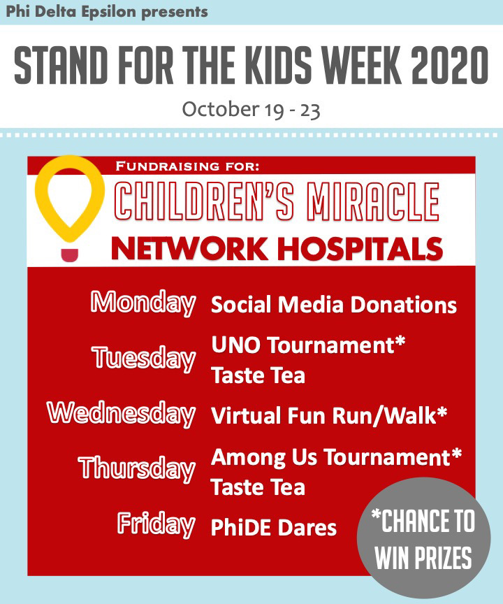 Stand for the Kids Week starts this Monday, Oct 19th—get HYPED! This will be a week full of fun games and prizes! Register with the link below and follow us on instagram @umbcphide for more information about the events! 100% of the proceeds of all of our events will be going to our local CMN Hospital, the Johns Hopkins Children’s Center. Help us do our part to support children and their families who need help now more than ever in the middle of this pandemic!