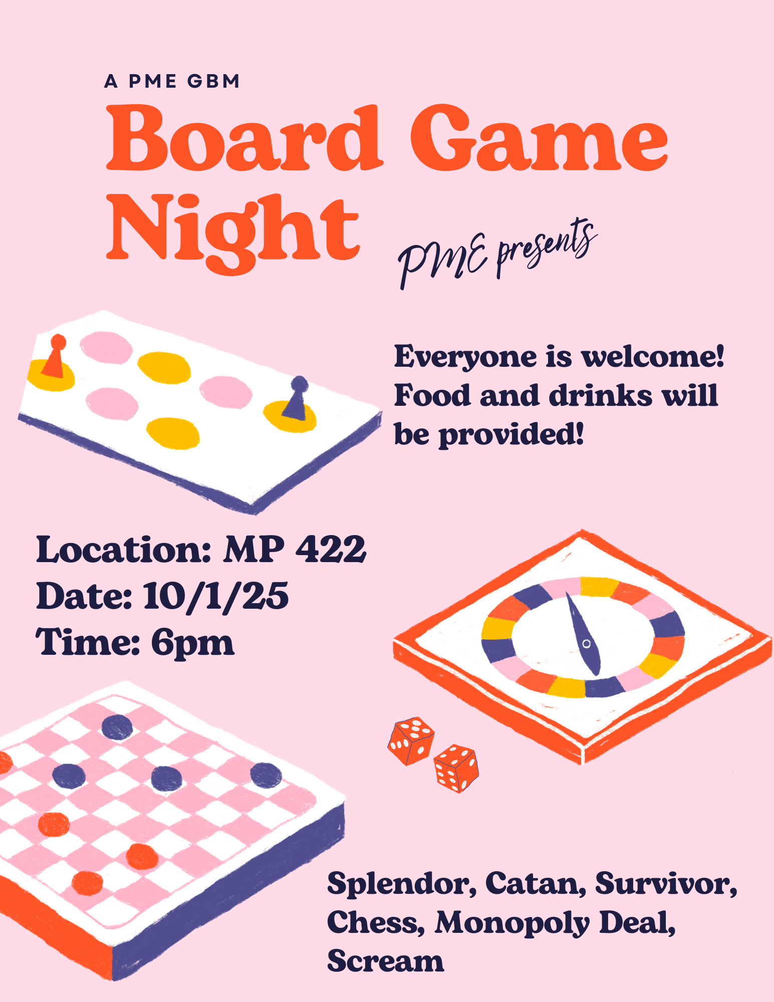 Bring your friends and come have some food and play some games in the Math Lounge for PME's first GBM on October 1st at 6pm! Feel free to bring your favorite games or come learn something new! Everyone is welcome :) Check out the flyer attached for more information and click the link to add the event to your Google Calendar.