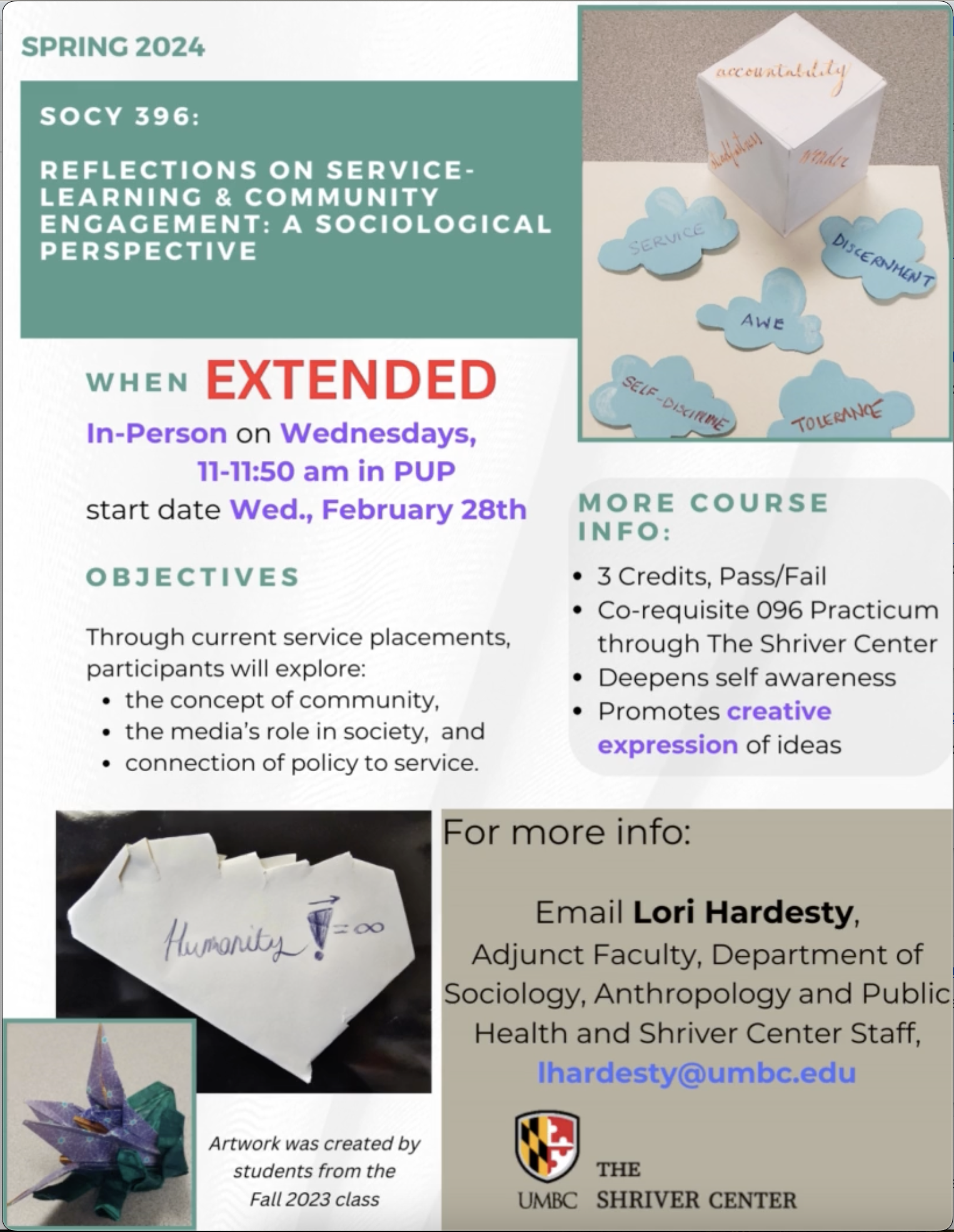 Because this course falls under the category of "Independent Study" it is still possible to enroll, but be sure to act quickly because the course begins on Wednesday, February 28th. Class meets every Wednesday from 11-11:50am. Please review the attached flyer. Questions may be directed to Lori Hardesty, Adjunct Faculty, Department of Sociology, Anthropology, and Public Health and Shriver Center Staff, LHardesty@umbc.edu.