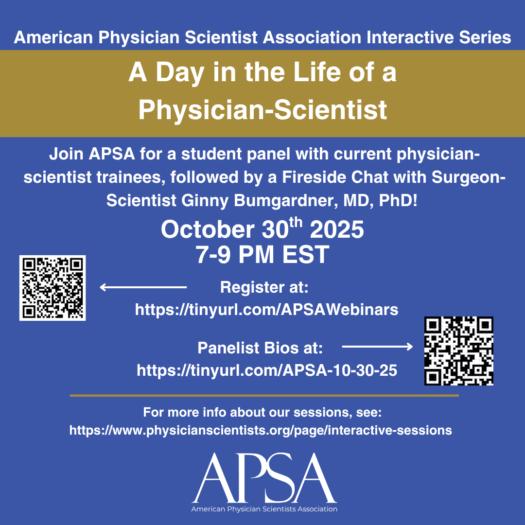 The American Physician Scientist Association (APSA) invites you to A Day in the Life of a Physician-Scientist on October 30th from 7–9 PM EST. The event will feature a student panel of MD/PhD trainees followed by a Fireside Chat with Ginny Bumgardner, MD, PhD, a surgeon-scientist who integrates clinical care and discovery. Join the session to explore the career path, hear personal insights, and learn what it takes to bridge science and medicine!