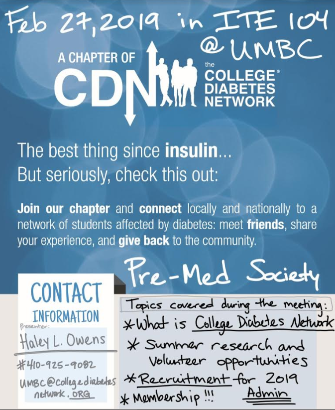 There will be a PreMedical Society meeting this week during which College Diabetes Network Chapterwill be on-campus to present information to students. Any interested Pre-health student is encouraged to attend and obtain information.