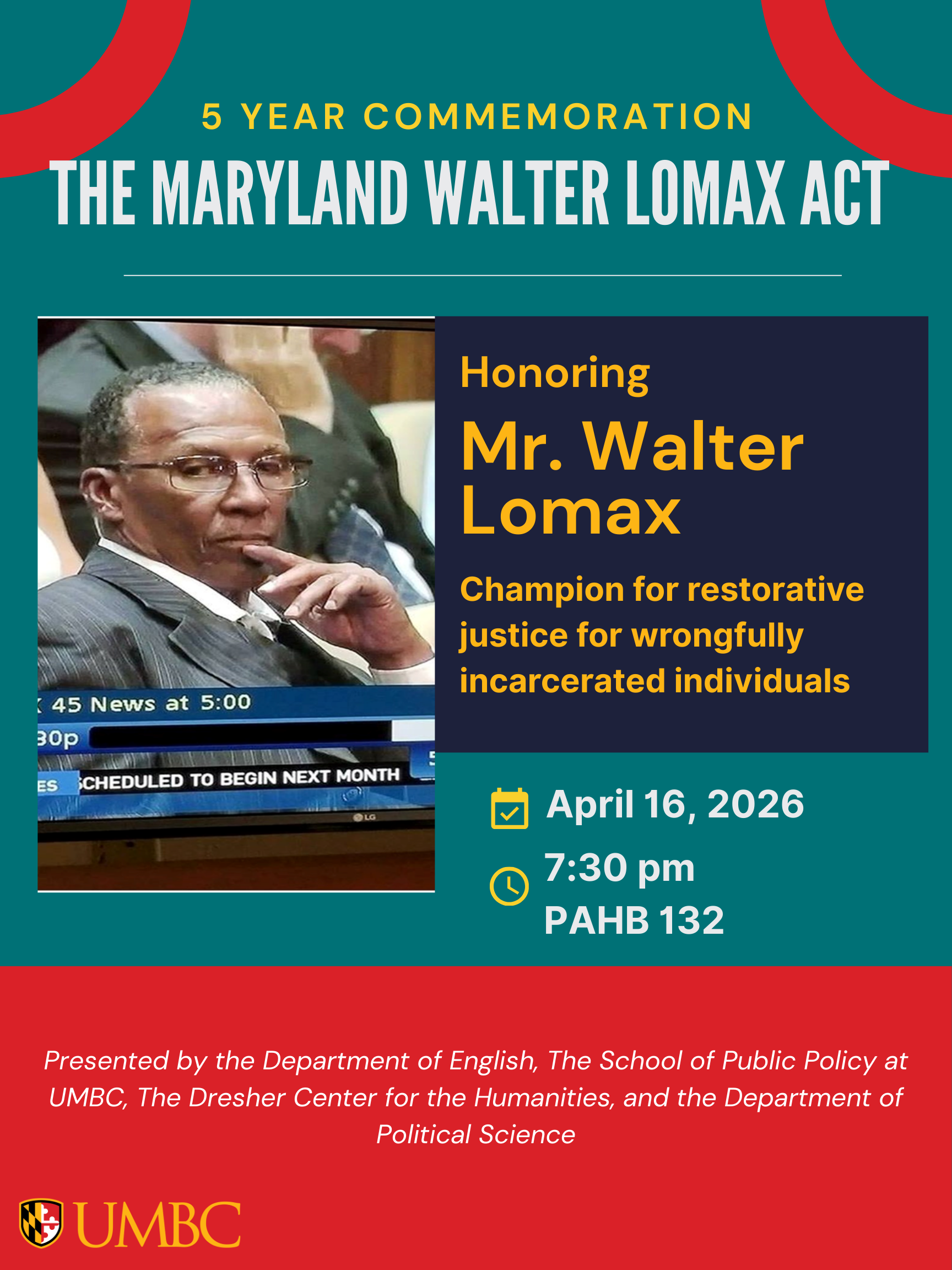 This event will feature Mr. Lomax, elected officials, members of the Maryland state government, and others integral in the passing of the Act, which compensates wrongly convicted and incarcerated individuals.
