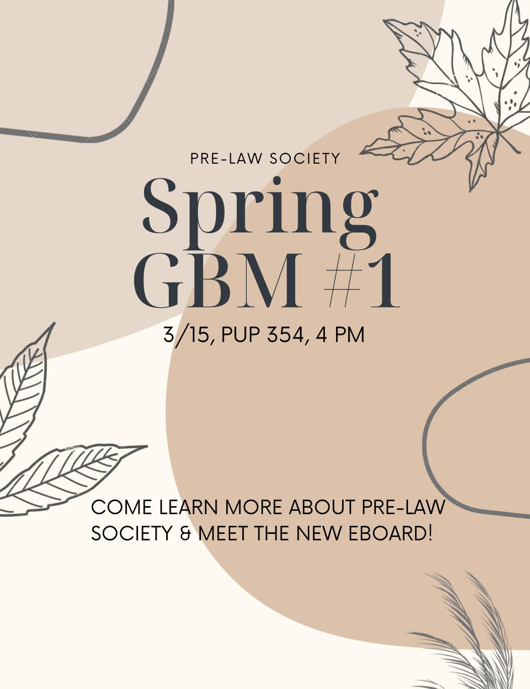 Hello to everyone!! The Pre-Law Society will be holding its first Spring General Body meeting on Wednesday, March 15th. There will also be refreshments served and a lot of information shared. We all hope to see you there.
