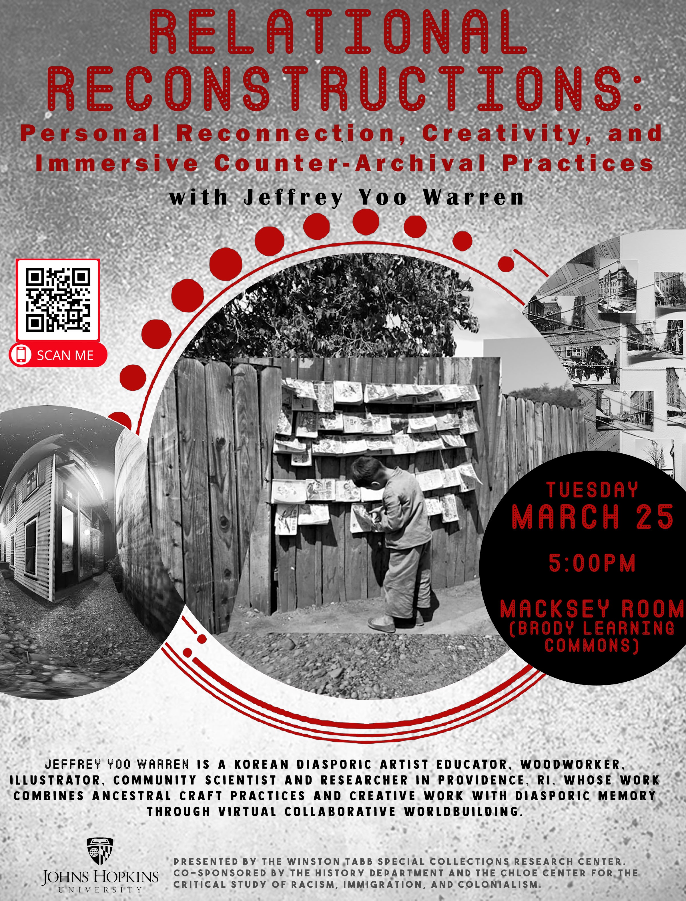 The Winston Tabb Special Collections Research Center is delighted to host Jeffrey Yoo Warren, a Korean diasporic artist/educator, illustrator, and public historian for a talk titled "Relational Reconstructions: Personal Reconnection, Creativity, and Immersive Counter-Archival Practices.” The event is co-sponsored by the Department of History and the Chloe Center for the Critical Study of Racism, Immigration, and Colonialism.