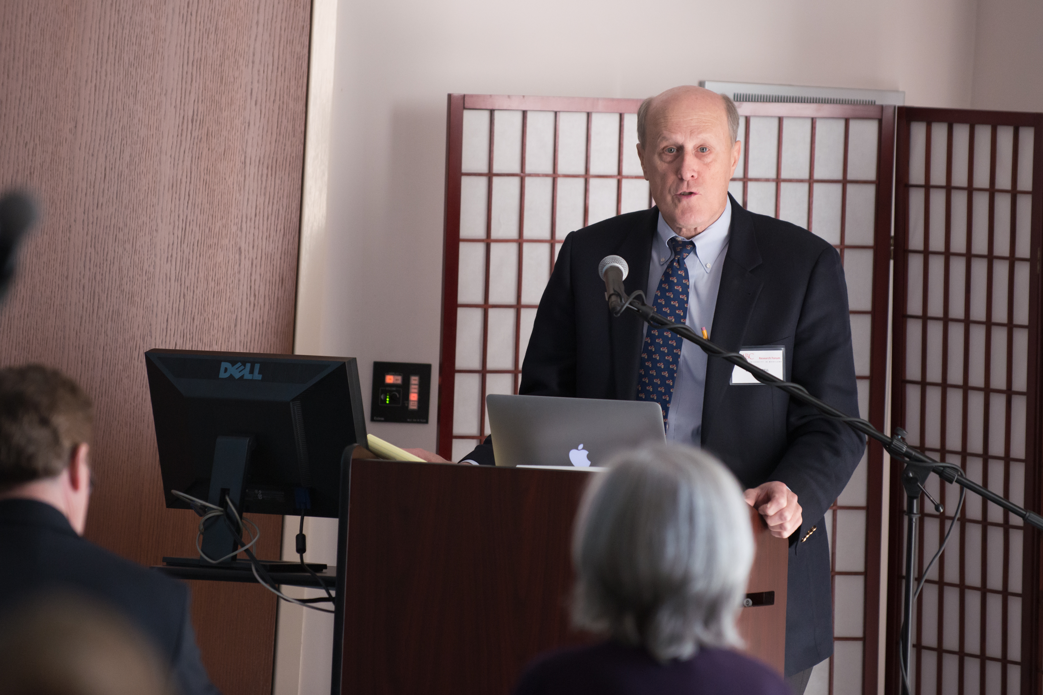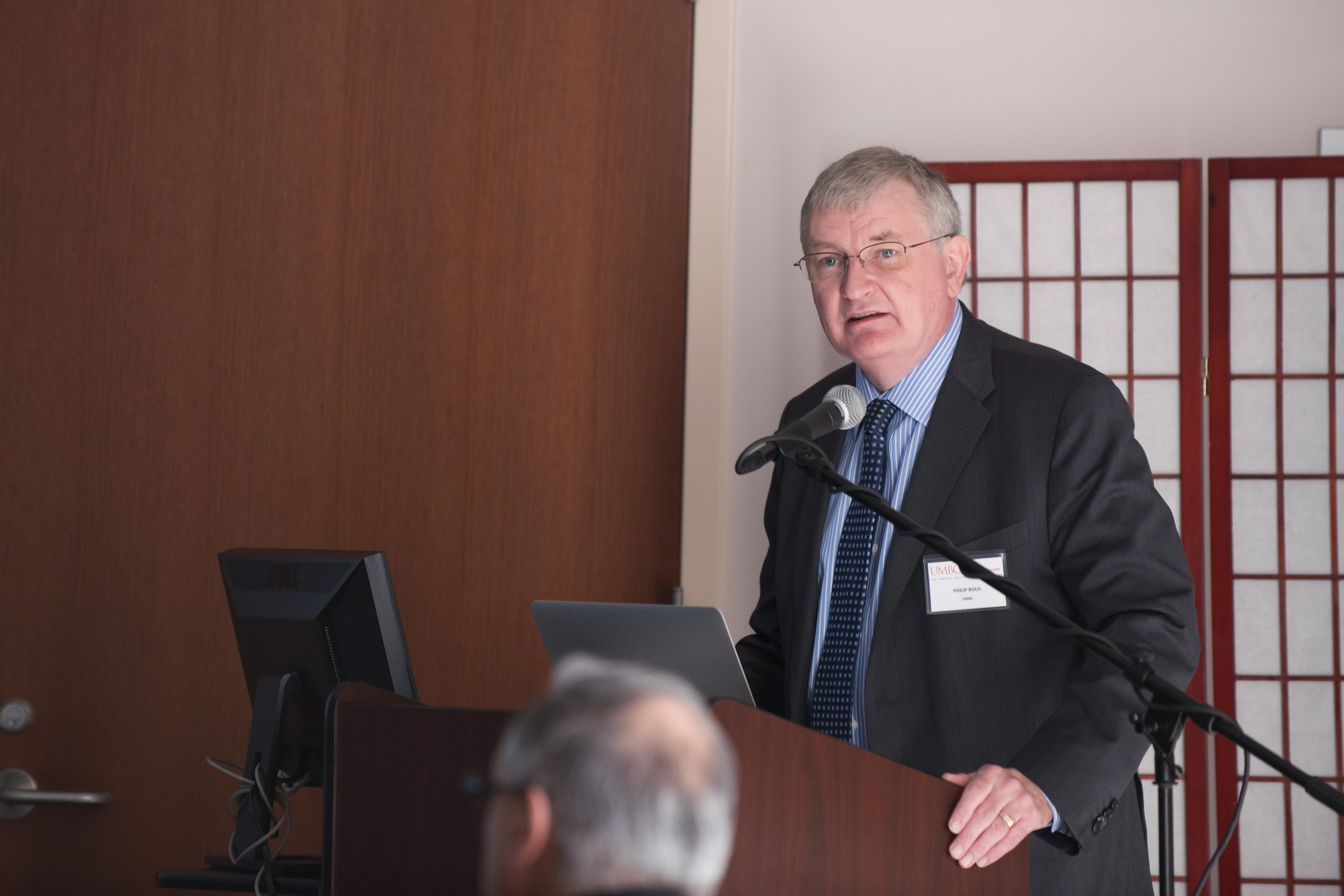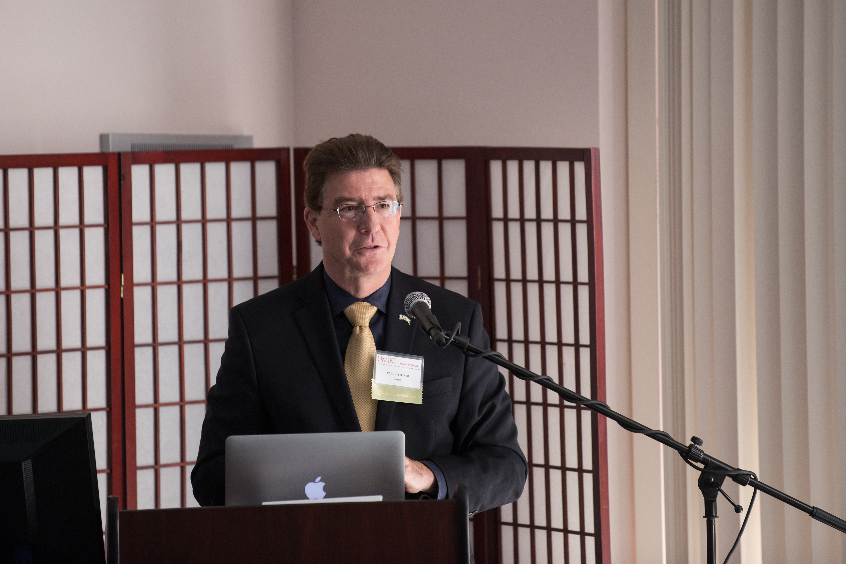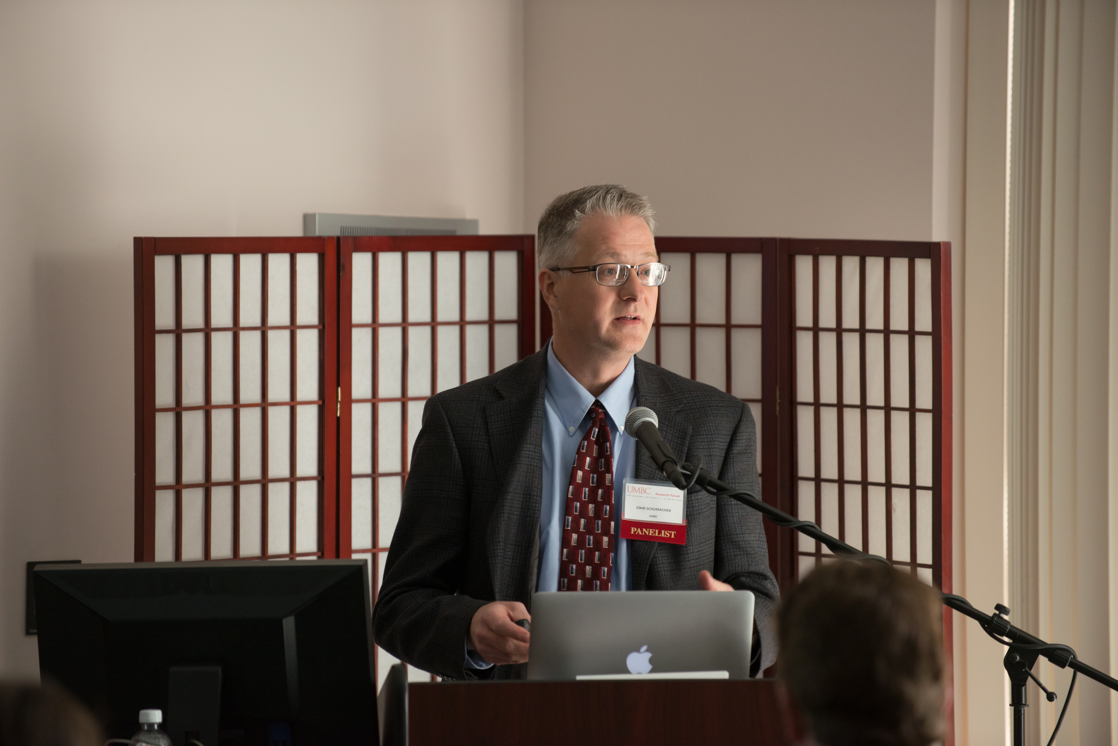 Researchers from UMBC and UMB participated in a panel discussion that focused on developing meaningful links across disciplines. John Schumacher, an associate professor of sociology, discussed strategies for seeking research partners and establishing leaders and milestones to advance interdisciplinary research projects. Fadia Shaya, a professor of pharmaceutical health services research at UMB, discussed how developing peer support and establishing social networks can lead to improved outcomes. UMBC professors Shari Waldstein (psychology) and Brian Cullum (chemistry and biochemistry), shared their insights on strategies for collaboration across disciplines, including building on pilot data and prior research to advance projects. Lee Boot, associate director of UMBC’s Imaging Research Center, discussed how discipline silos no longer exist and how collaboration is needed to solve problems.