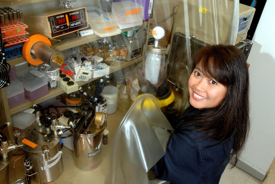 Ethel Apolinario, research assistant and lab manager in Professor Kevin Sowers' lab, works with methanogens in an anaerobic glove box. (Kevin Sowers)