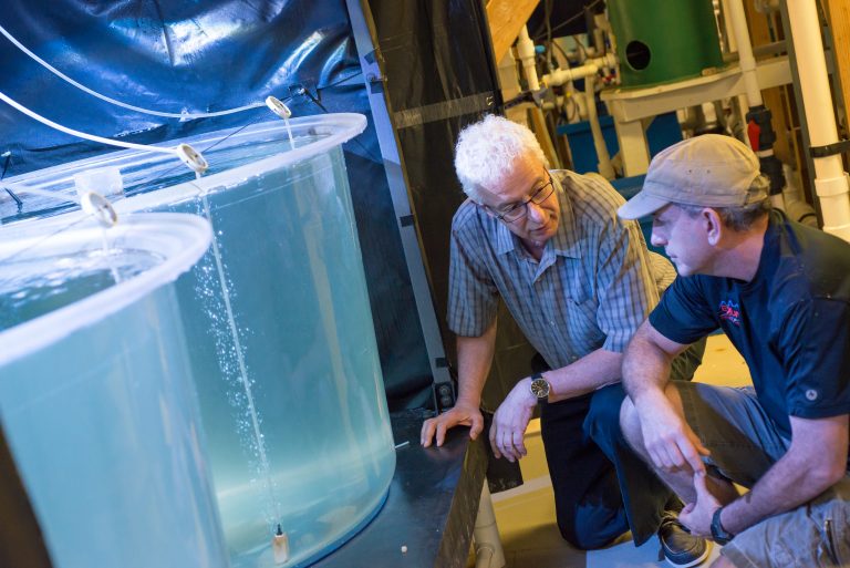 Yoni Zohar (l) and Jorge Gomezjurado (r) watching bluefin tuna larvae at IMET aquaculture research facility.