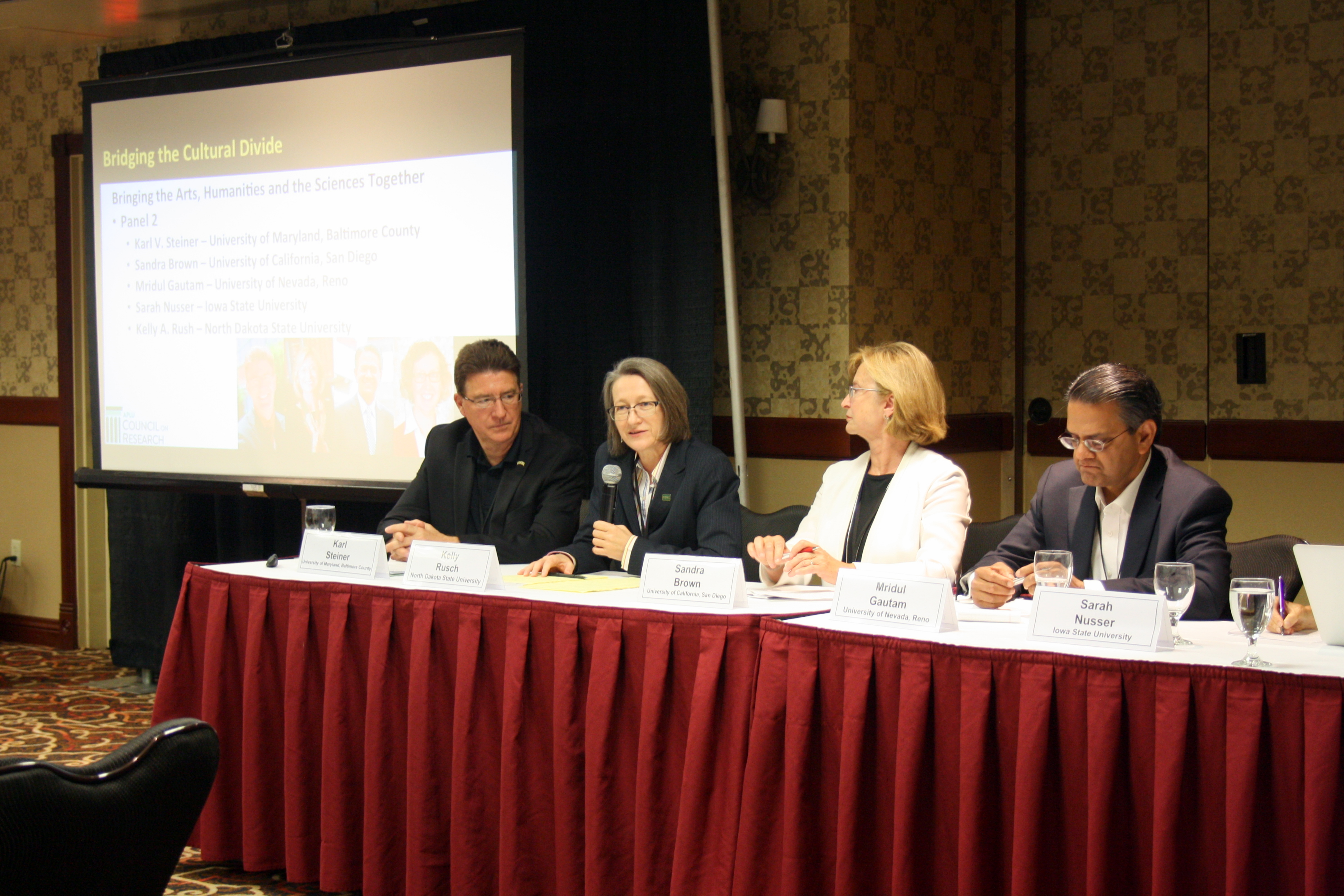 Karl Steiner moderates "Bridging the Cultural Divide: Bringing the Arts, Humanities, and Sciences Together." Left to right: Karl Steiner, Kelly Rusch, Sandra Brown, Mridul Gautam. Photo credit: Sarah Rovito.