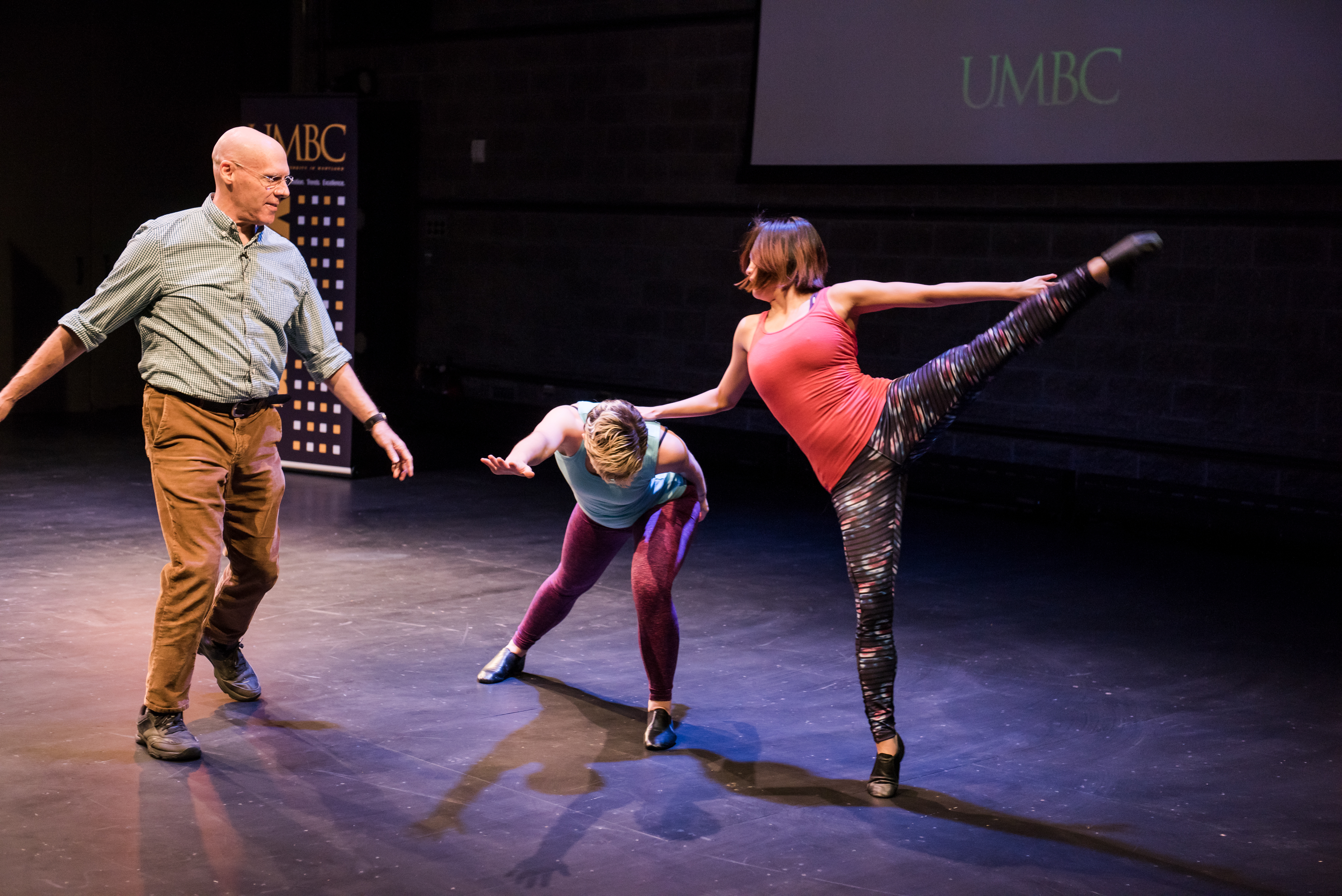 Finally, Doug Hamby, associate professor of dance, and two UMBC dance students, Emily Godfrey ’20 and Samantha Siegel ’18, created an original dance right before the audience’s eyes. Hamby gave them instructions and they absorbed them on the spot, performing turns, rolls, and pliés to the audience’s delight. “When I make a dance,” Hamby shared as he moved fluidly across the stage, “I like to think of it as an investigation of the human body in motion, and in space, and in time.”