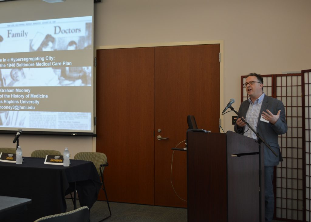 Keynote speaker Graham Mooney, professor in the Institute of the History of Medicine at Johns Hopkins University, presented his research on the Baltimore Medical Care Plan of 1948. “By using the history of medicine and public policy we can better understand how the process of racism and segregation have interacted to prevent black residents’ access to quality medical care in Baltimore,” explained Mooney.