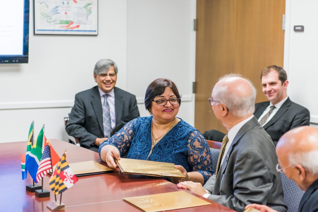 Jesika Singh, University of Limpopo (center left), and Antonio Moreira, UMBC (center right), complete the signing process.