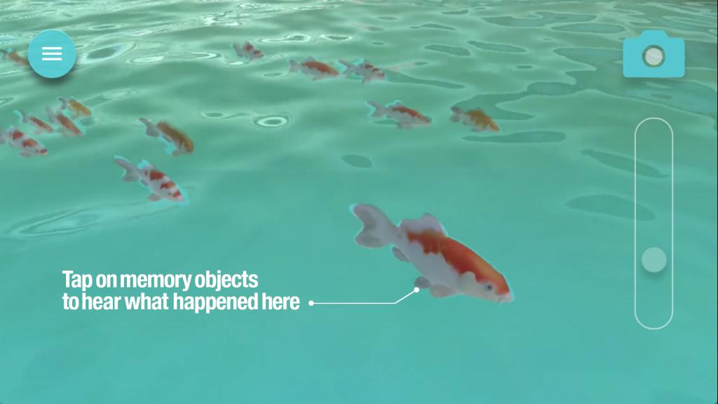 The app, which is available for both iOS and Android devices, projects a full-scale 3D image of McKeldin Fountain onto tablet or smartphone screens, creating the illusion that the fountain is present in the surrounding environment. The fountain’s history is told through various interactive “memory artifacts,” such as koi fish and protest signs, which when clicked will show interviews with Baltimore residents sharing their memories of events at McKeldin Square. The app can be downloaded for free and used anywhere in the world, but its effects are best realized when used on McKeldin Square where the fountain once stood.