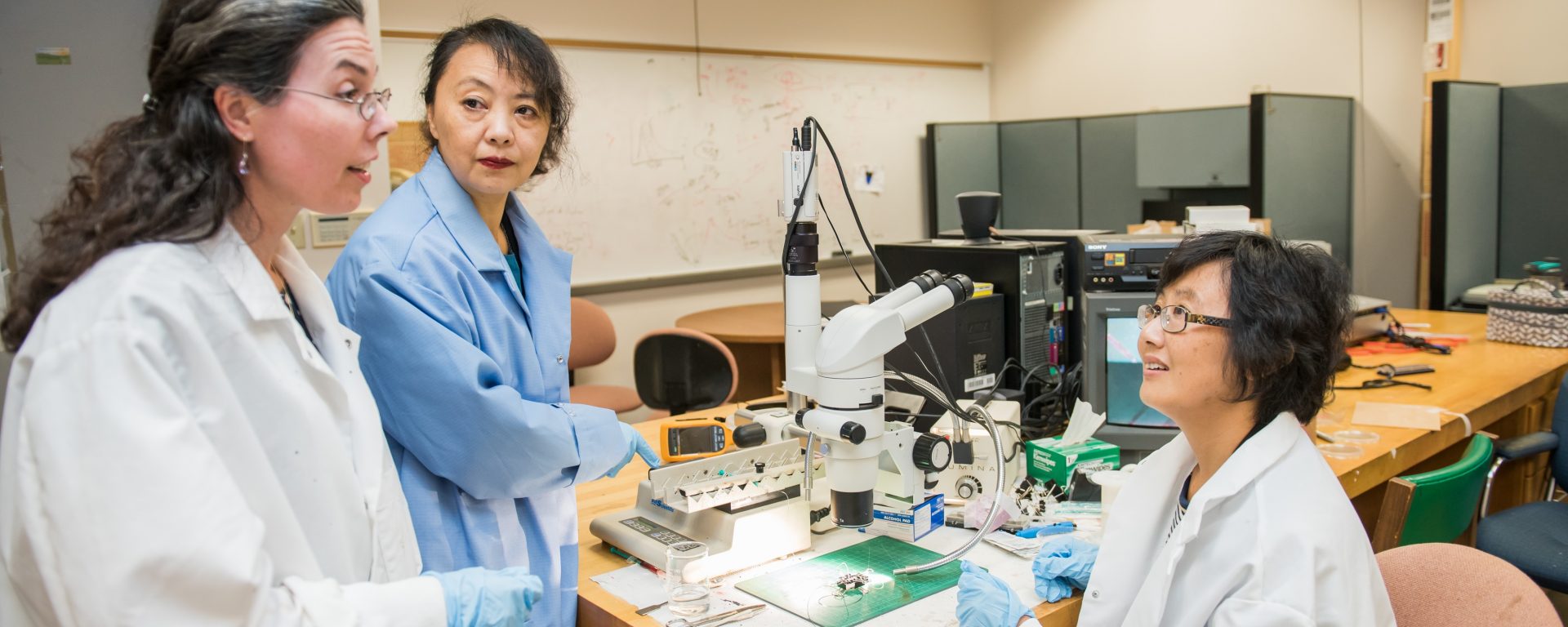 Banner image: Marie Christine Daniel-Onuta, right, Liang Zhu, and Ronghui Ma working in the lab. All photo by Marlayna Demond ’11 for UMBC.