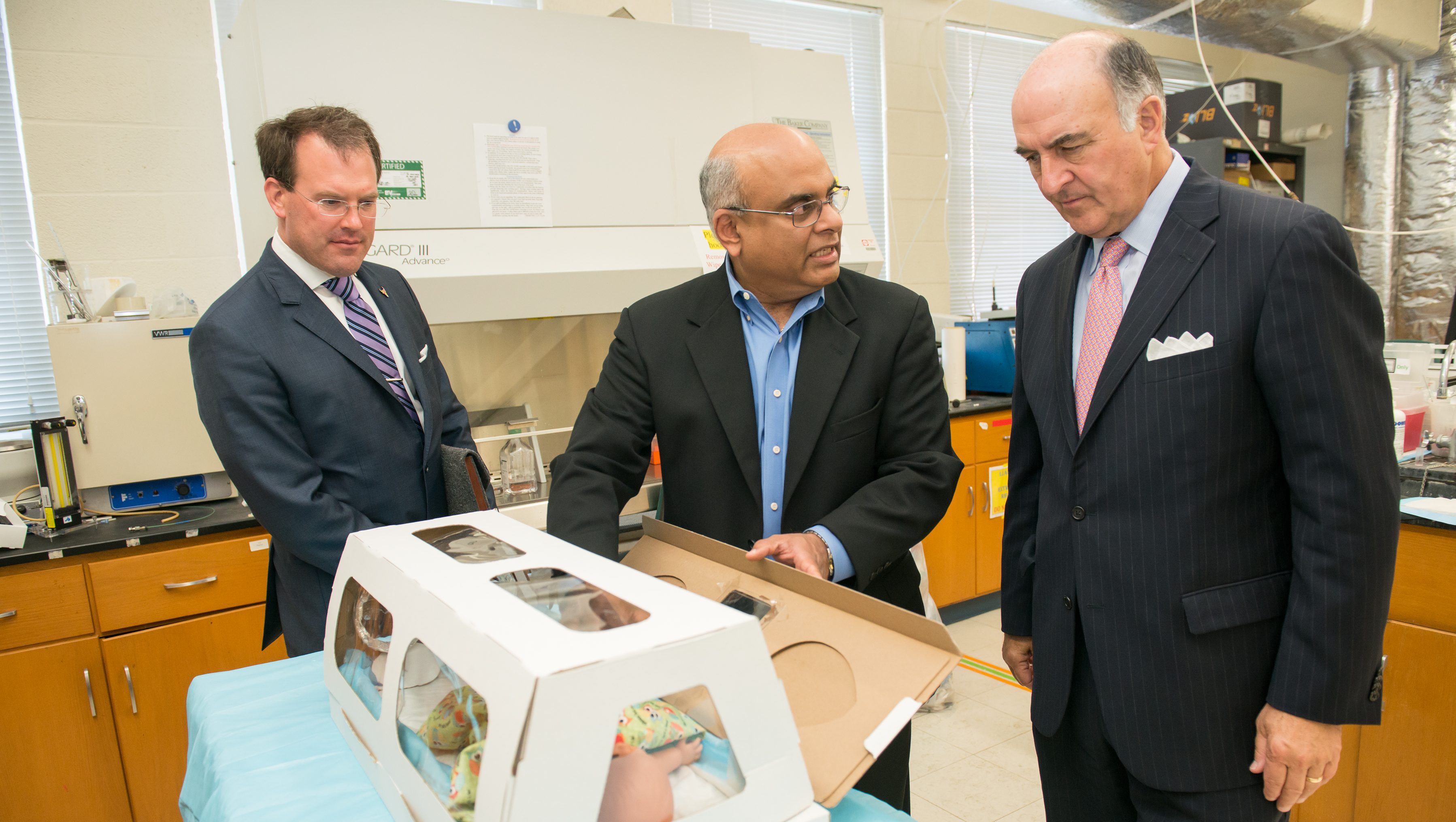 Govind Rao, center, explaining the cardboard incubator that he and his collaborators have developed to Maryland Secretary of Commerce Mike Gill. Photo by Marlayna Demond ’11 for UMBC.