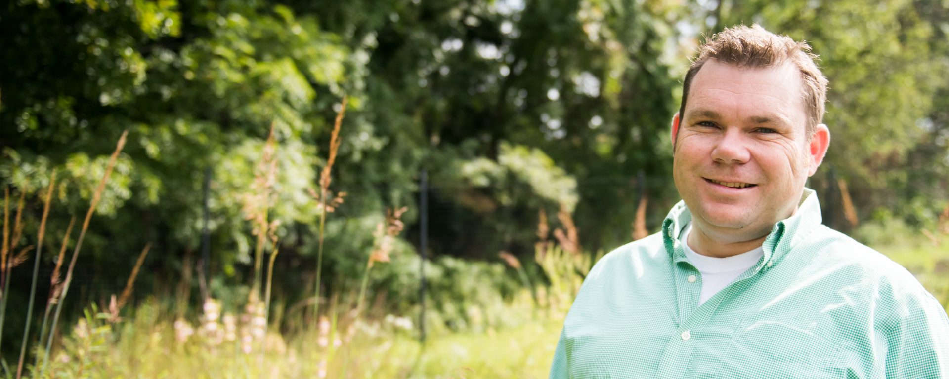 Chris Swan checks on plants at the UMBC greenhouses for use in restoration projects. Photo by Marlayna Demond ’11 for UMBC.