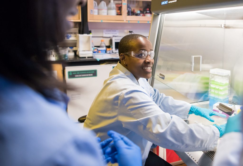 Naomi Mburu ’18, UMBC’s first Rhodes Scholar, works in the lab with faculty mentor.