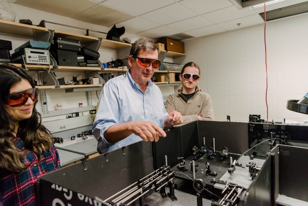 Brad Arnold (center) examines the laser setup with Sara Tahir ’21, biochemistry, and Eric Bowman (right), Ph.D. student in chemistry.