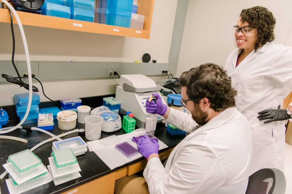 Ph.D. student Tyler Brown and his (and Stellwagen’s) advisor Mercedes Burns, assistant professor of biological sciences, conduct genetic testing on harvestmen DNA. Harvestmen (often called “daddy-long-legs”) are close relatives of spiders.