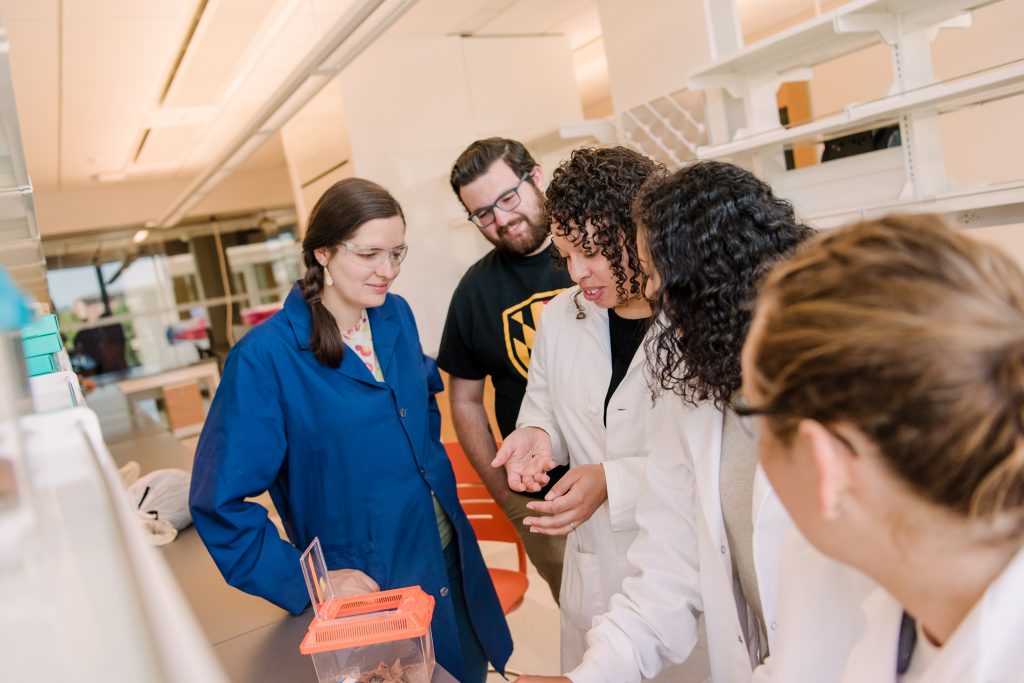 From left to right: Postdoc Sarah Stellwagen, Ph.D. student Tyler Brown, assistant professor Mercedes Burns, and two undergraduate students check out a harvestman, a type of arachnid related to spiders, in a research lab in the Interdisciplinary Life Sciences Building (ILSB).